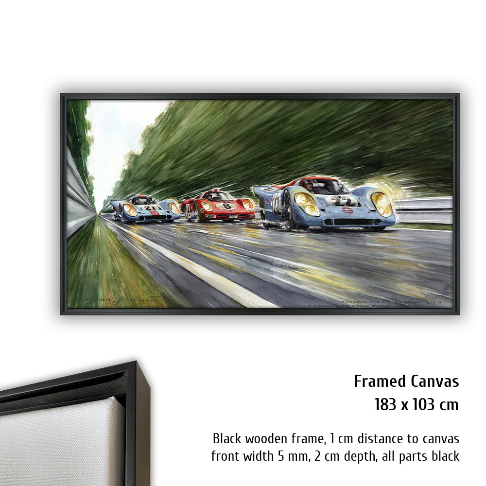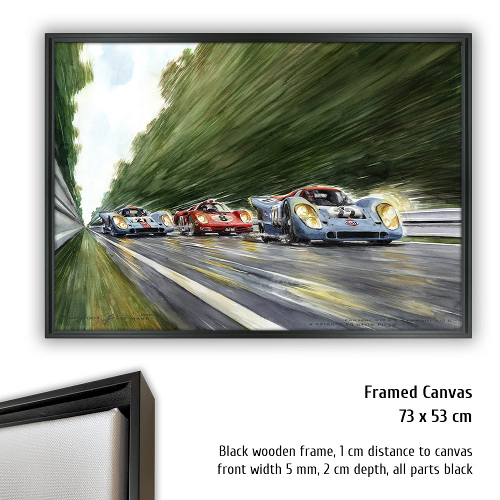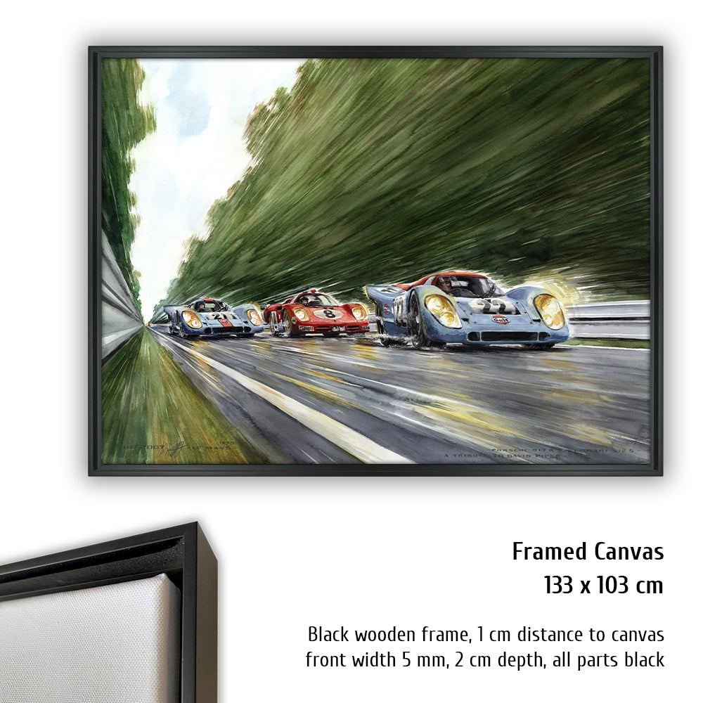 Perhaps the most famous sports car o"&"f all time races out of the Arnage corner toward the Porsche Curves. Not a single Gulf-colored Porsche 917 driven by John Wyer will complete the entire distance in 1970, but thanks to Hollywood and Steve McQueen, the Gulf-colored 917s are given a legend t"&"hat isn't true for Le Mans 1970. The #20 917 crashes in the film. David Piper lost a leg during filming for the stunts because he performed the crash scene in the Porsche curves too violently. However, the painted scene in Uli Ehret's watercolor depicts t"&"he final lap in the film, when McQueen switched to the #21 917 and blocked ""Erich Stahler"" so that the leading #22 Porsche could win.