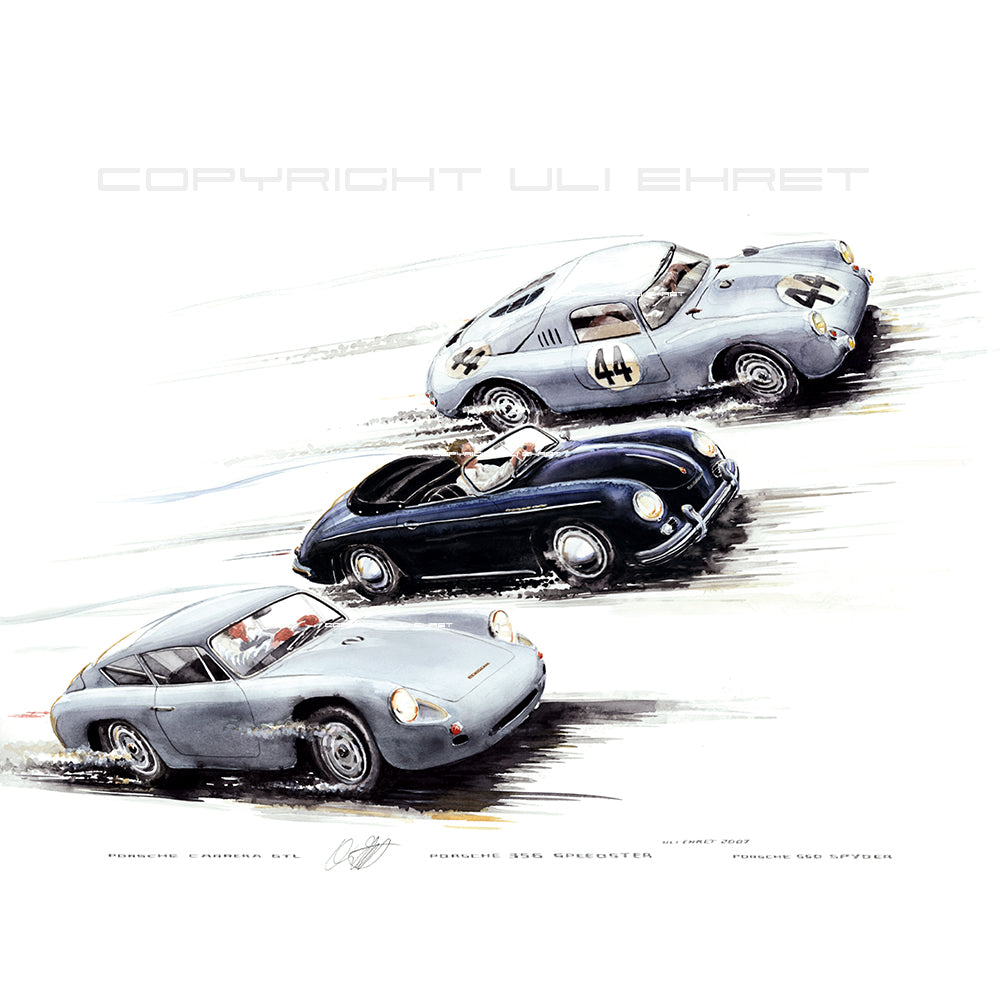 This Painting was commissioned by the 356 and 550 Club Germany for their Germany event in Cologne in 2007. At the top, you can see the 550 prototype driven by Hans Herrman"&"n & Co. at Le Mans in 1956. Below, a production car, a 356 Speedster, is shown. The bottom car is an ultra-rare Abarth Porsche, the Carrera GTL, which served as the ""star guest"" at the Cologne event.