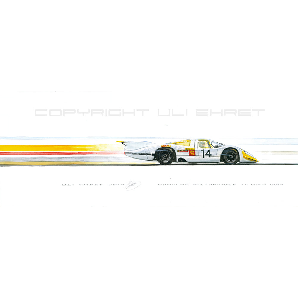 The 917 was designed and built by Porsche in a very short time for the 1969 24 Hours of Le Mans. The long-tail version still featured movable rear wings, which, however, di"&"d not provide the car with the necessary downforce and were banned in 1970. The 917 was still extremely unstable at high speeds. Three long-tail versions started, but none saw the finish line. Starting number 14, the works car driven by Rolf Stommelen and"&" Kurt Ahrens, had to retire due to problems with the gearbox housing. A completely redesigned car would win the 24 Hours for the first time the following year.