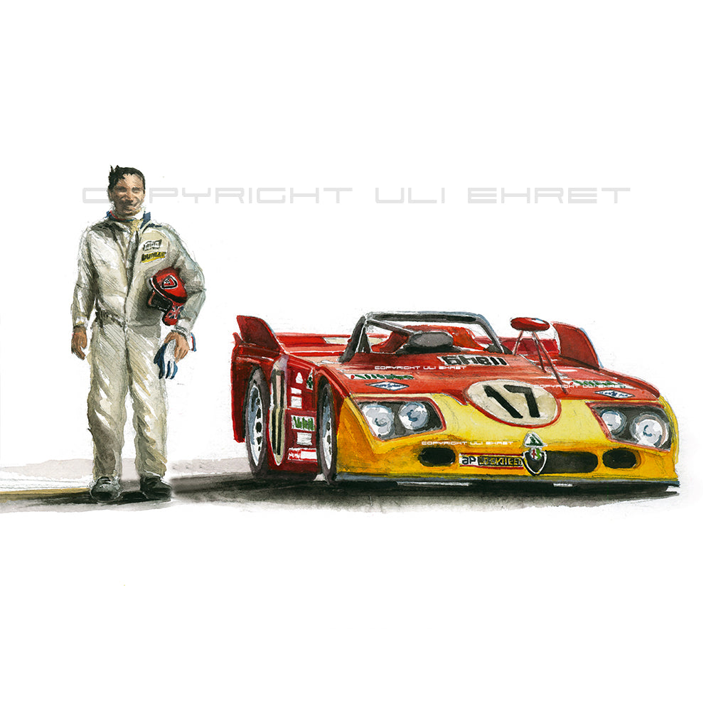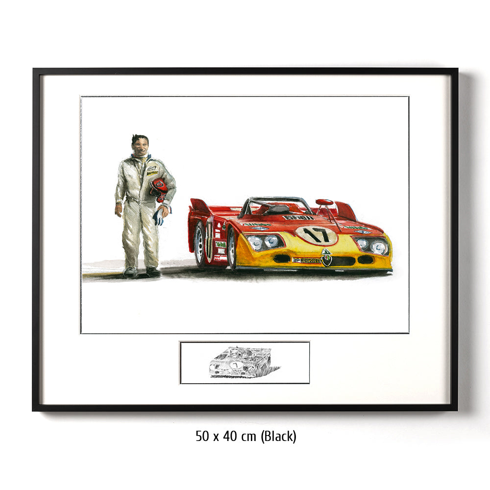 Vic Elford se tient à côté de l'Alfa Romeo BT 33 qu'il conduisait dans la Targa Florio de 1973.