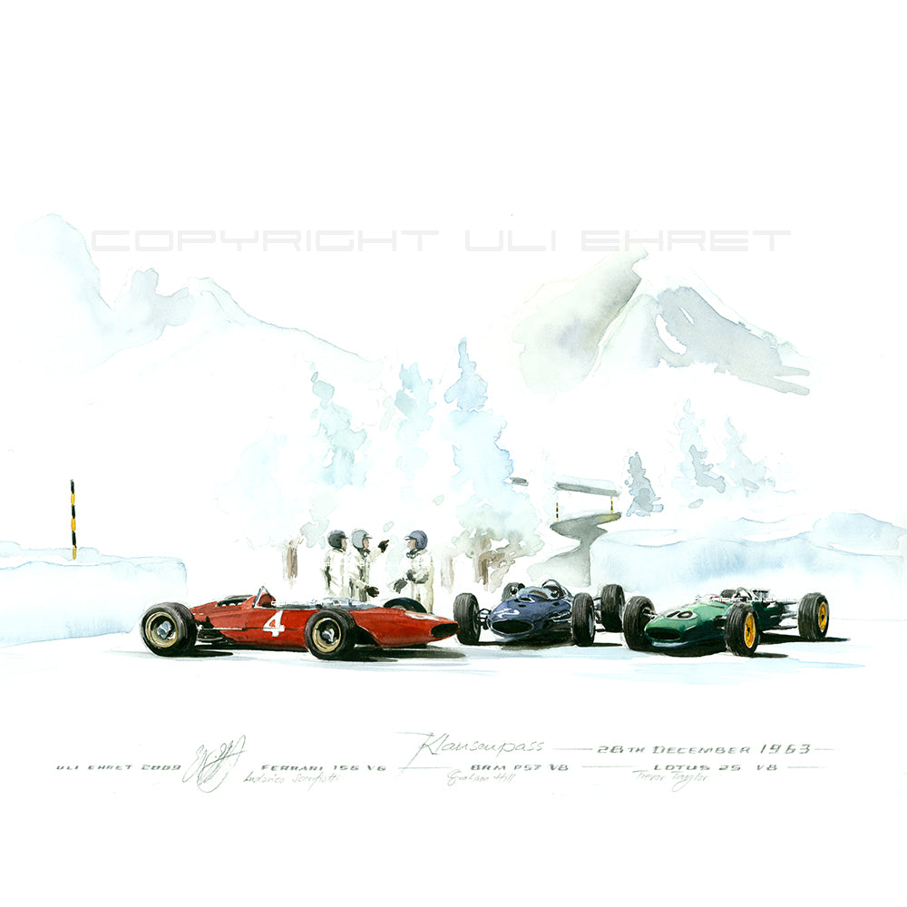 Graham Hill appelle Ludovico Scarfiotti le 25 décembre 1963 : « Hé Ludovico, pourquoi ne pas faire le col du Klausen en décembre ? On s'amuserait beaucoup ! ». "Tu as raison Graham, demandons à Trevor de se joindre à nous pour une belle journée dans les Alpes." Je réserve une table au Klausenpass Restaurant en haut du col. Le dernier paie la facture. » « OK Ludovico, à dans trois jours ! » « Joyeux Noël au fait ! ». Ce serait certainement fascinant de voir les trois pur-sang s'affronter en montée. Peut-être que la police autrichienne n'aurait pas été amusée, mais comme je l'ai dit, tout est possible dans un conte de fées.