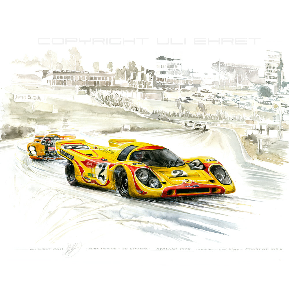 Les Kyalami Nine Hours étaient l'événement phare de la série sud-africaine Springbok Trophy et bien qu'elles ne soient pas classées comme une course du Championnat du monde des voitures de sport, elles ont attiré un certain nombre de pilotes de haut niveau. Sur la photo, Jo Siffert et Kurt Ahrens dans la Porsche Martini Racing Team en route pour la deuxième place au classement général de l'édition 1970 de la course, suivis de la même voiture Team Gunston de Richard Attwood et John Love.