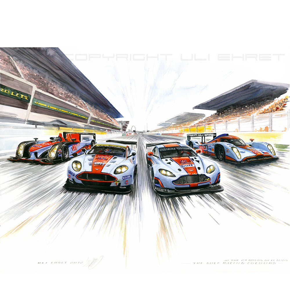 Les voitures de course LMP1 et GT d'Aston Martin ont porté la mythique combinaison de couleurs bleu clair et orange de Gulf Oil au Mans pendant près d'une décennie. La DBR9 en tant que vainqueur de la classe GT1 (au milieu à gauche), l'AMR1-2 développée à partir de la Lola qui a terminé quatrième au classement général en 2009 (à l'extrême droite), l'AMR-One innovante mais fragile du Mans 2012 (à l'extrême gauche) et la Vantage GTE, qui ont également monté un podium LM GTE Pro en 2012 (au centre à droite) ont toutes atteint le rang d'icône du Golfe.