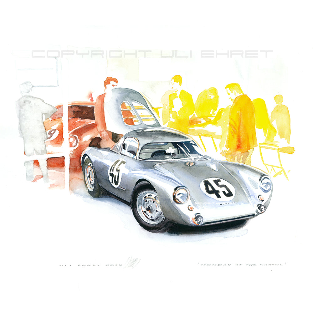 Pour les 24 Heures du Mans en 1953, le directeur de course de Porsche Huschke von Hanstein et l'ingénieur de course Wilhelm Held se sont appuyés sur la version fermée de la 550 Spyder, qui était plus rapide en pratique que les voitures à toit ouvert de l'année précédente. Il s'agit de l'un des deux coupés 550 aux lignes épurées, numéro 45 dans la catégorie 1,5 litre, piloté par Richard von Frankenberg et Paul Frère. Ils ont clairement remporté leur classe et ont terminé quinzième au général. Ici, le lundi précédant la grande course, la 550 se prépare pour les prochains jours de courses et de vérifications au cœur du Mans.