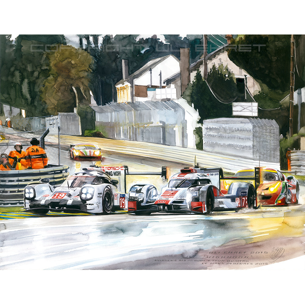 La victoire au général a été précédée d'un duel passionnant sur toute la distance de course : l'Audi R18, maintes fois éprouvée, issue de l'expérience de 13 victoires en 15 ans, et la relativement nouvelle Porsche 919 Hybrid dans sa seule version deuxième année de fonctionnement. Voici le duel intense des leaders alors qu'ils négocient la première chicane - spectaculairement éclairée par les deux Ferrari 458 Italia GTE de l'équipe AF Corse qui viennent de passer. La voiture numéro 19 remportera le "Highnoon Duel", l'Audi numéro 7 terminera à la troisième place.
