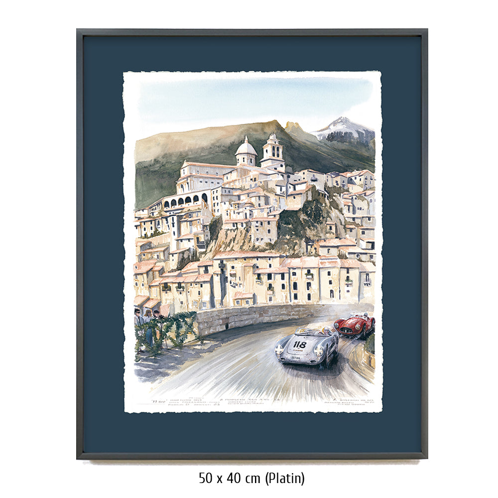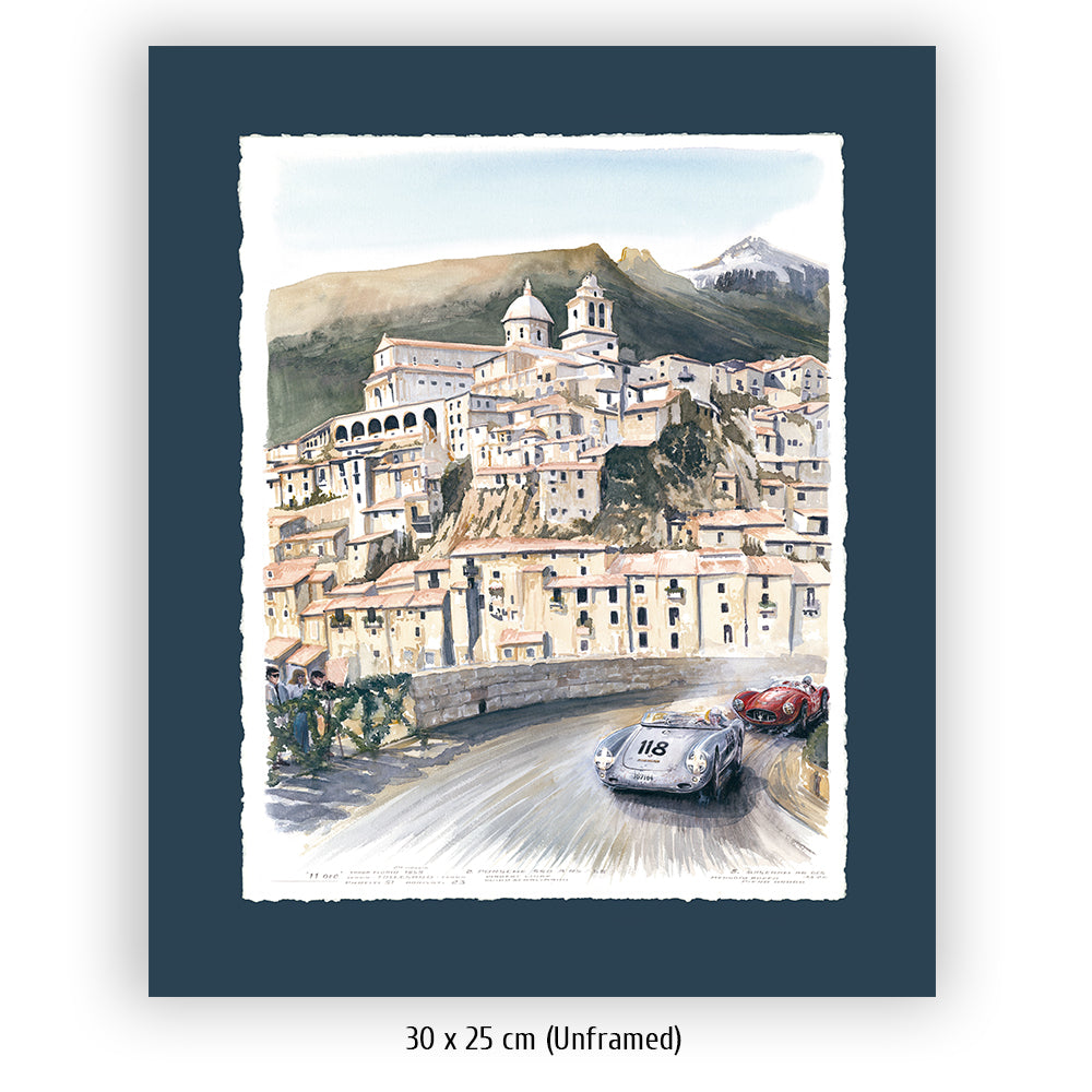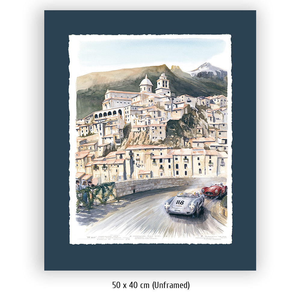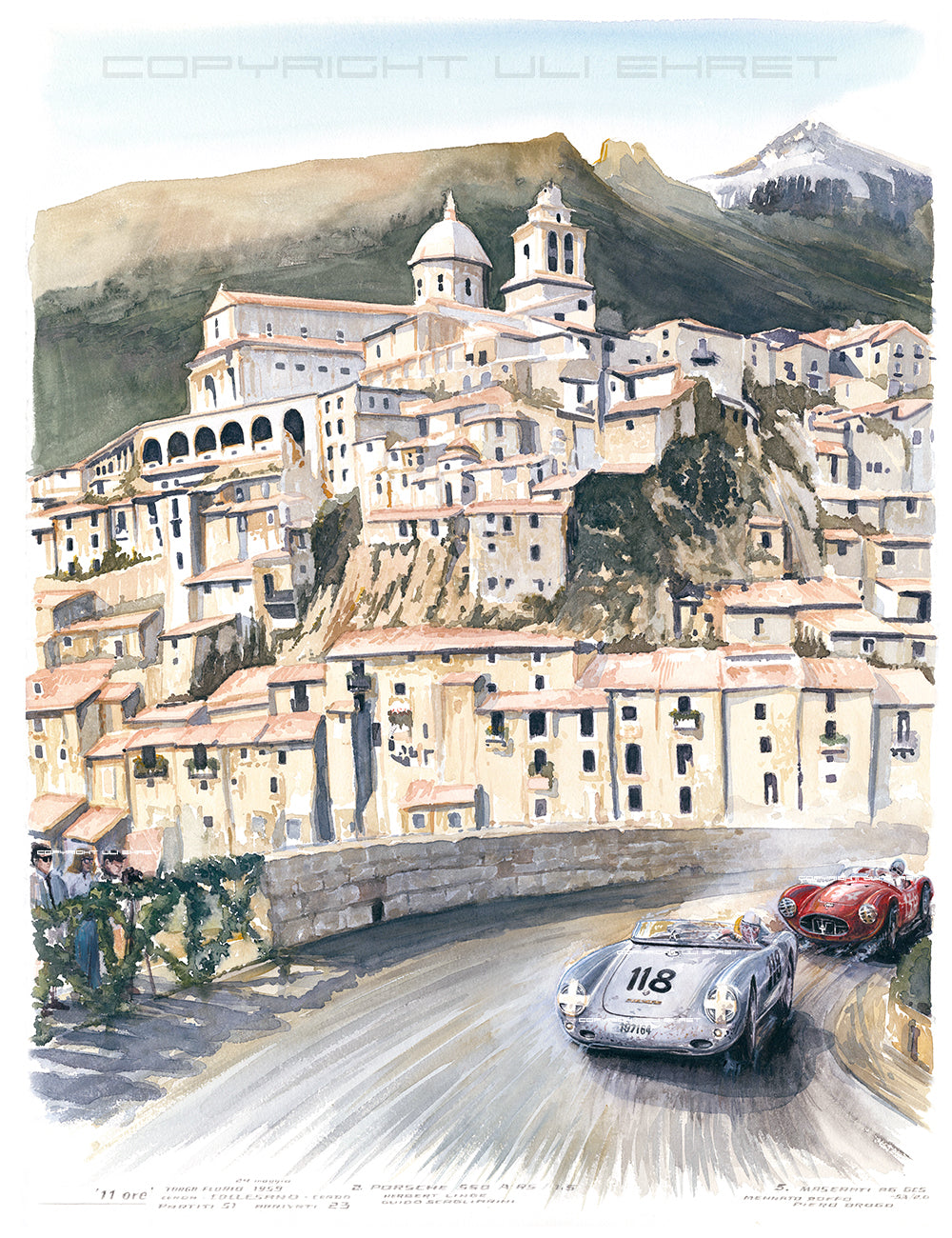 Herbert Linge und Guido Scagliarini fahren am 24. Mai 1959 mit ihrem Porsche 550 während der Targa Florio durch das Bergdorf Collesano. Mehr als 11 Stunden am Steuer, unter der mediterranen Sonne, über holprige Straßen, können sie den gewonnenen Überlebenskampf für Mensch und Maschine mit dem zweiten Gesamtplatz feiern. Die vier favorisierten Ferrari Testa Rossa fielen über den Renntag einer nach dem anderen dem mörderischen Test der Automobiltechnik zum Opfer. Graf Berghe von Trips und Joakim Bonnier schieden mit ihrem Porsche RSK aus. Auch die Fahrerpaarung Umberto Maglioli – Hans Herrmann musste ihren RSK 718 frühzeitig abstellen. Edgar Barth und Wolfgang Seidel gewannen die Targa Florio 1959 mit einem Schnitt von 91,309 km/h und knapp zwanzig Minuten vor Linge/Scaglarini. Zwei Porsche 356 A Carrera mit ihren 1,6 Liter Motoren folgten - mit Hanstein/Pucci auf dem dritten Platz und Strähle/Mahle auf dem vierten. Der als Fahrzeugdesigner bekannte Piero Drogo erreichte mit Beifahrer Mennato Boffa auf dem Maserati A6 GCS-53 nach 11 Stunden und 41 min das Ziel auf Platz fünf.