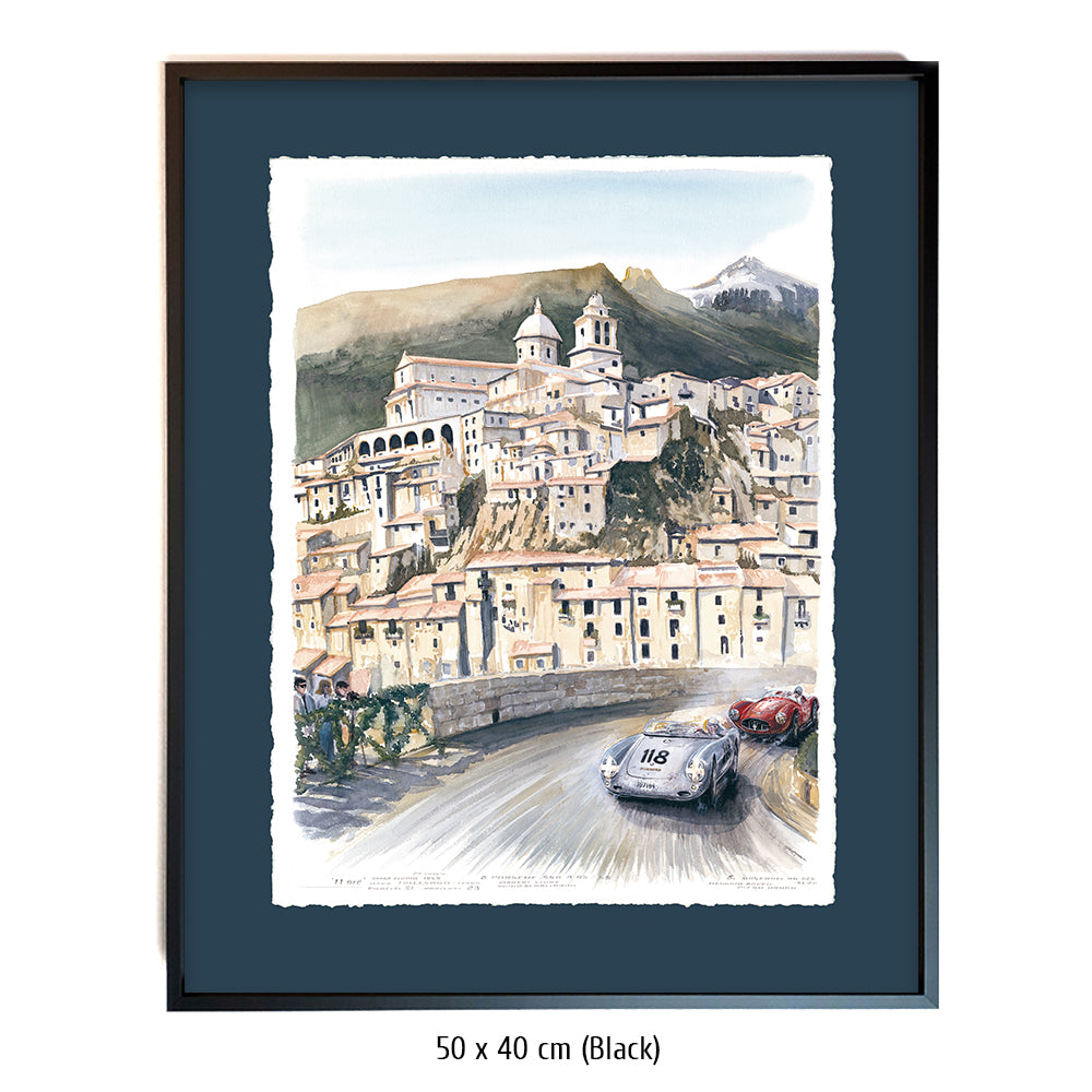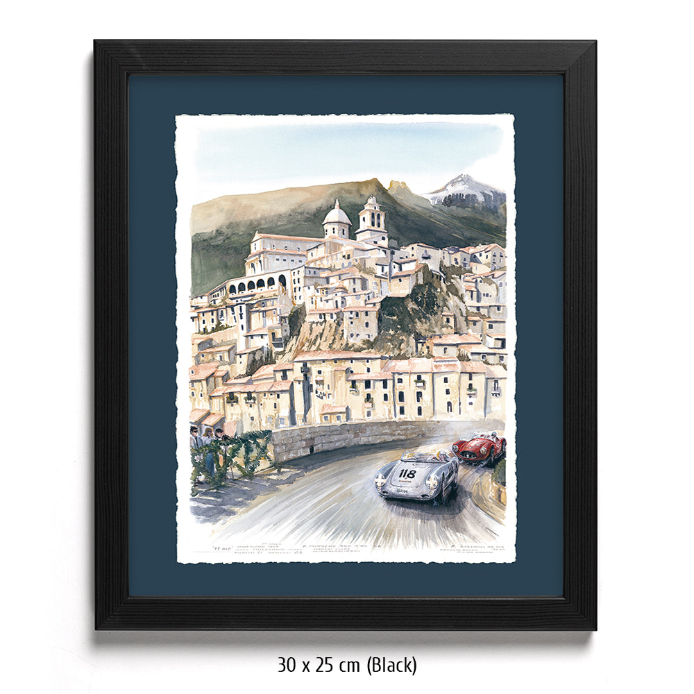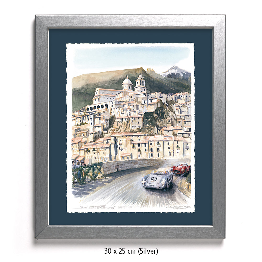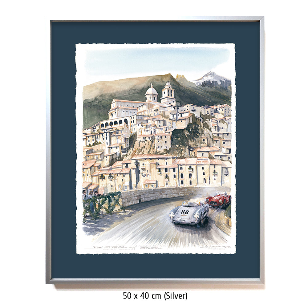 Herbert Linge und Guido Scagliarini fahren am 24. Mai 1959 mit ihrem Porsche 550 während der Targa Florio durch das Bergdorf Collesano. Mehr als 11 Stunden am Steuer, unter der mediterranen Sonne, über holprige Straßen, können sie den gewonnenen Überlebenskampf für Mensch und Maschine mit dem zweiten Gesamtplatz feiern. Die vier favorisierten Ferrari Testa Rossa fielen über den Renntag einer nach dem anderen dem mörderischen Test der Automobiltechnik zum Opfer. Graf Berghe von Trips und Joakim Bonnier schieden mit ihrem Porsche RSK aus. Auch die Fahrerpaarung Umberto Maglioli – Hans Herrmann musste ihren RSK 718 frühzeitig abstellen. Edgar Barth und Wolfgang Seidel gewannen die Targa Florio 1959 mit einem Schnitt von 91,309 km/h und knapp zwanzig Minuten vor Linge/Scaglarini. Zwei Porsche 356 A Carrera mit ihren 1,6 Liter Motoren folgten - mit Hanstein/Pucci auf dem dritten Platz und Strähle/Mahle auf dem vierten. Der als Fahrzeugdesigner bekannte Piero Drogo erreichte mit Beifahrer Mennato Boffa auf dem Maserati A6 GCS-53 nach 11 Stunden und 41 min das Ziel auf Platz fünf.