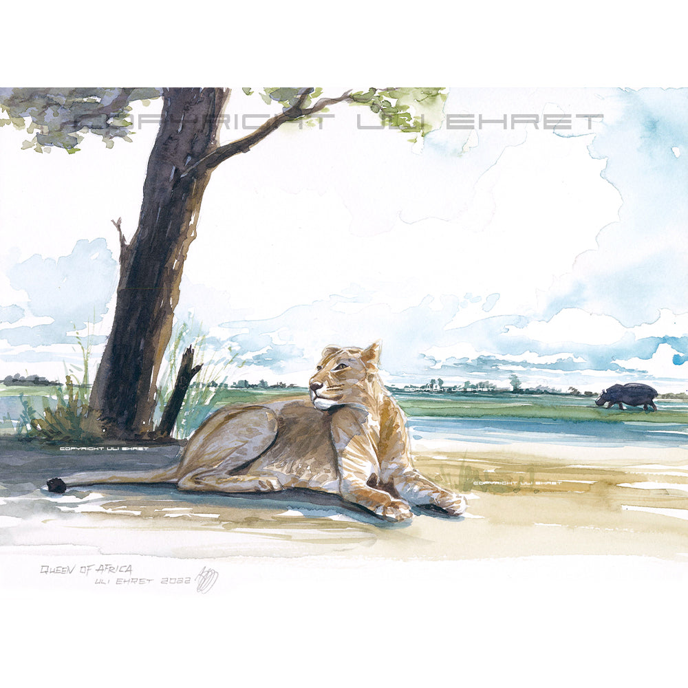 Der Chobe River Nationalpark hat uns völlig in seinen Bann gezogen. Wir sitzen in unserer "Regina" und genießen den unfassbaren Ausblick auf die Flussinseln im Chobe River. Wir fahren ein kleines Stück eiter und nehmen rechts von uns die Krokodile, Flusspferde und Elefanten wahr. Als ein anderes Fahrzeug fast unbemerkt auch auf den Strand des Flusses fährt und in einiger Entfernung bremst. Erst nach gewisser Zeit merken wir, dass die Insassen nicht den Fluss, sondern in Richtung des Landesinneren fotografieren. Und dann wird uns schlagartig klar warum. Die Löwin und ihre Schwester verspeisen gerade am Rande des Flusses ihre Abendmahlzeit. Seelenruhig - denn Jeeps sind Luft für die Löwen. Wir stehen also keine 30 Meter von den beiden und fahren langsam und leise an Sie heran. Ein unfassbarer Blick - Löwinnen in freier Wildbahn - ungestört. Einer der Höhepunkte unserer zweimonatigen Reise. Die "Queen of Africa" war noch lange unser Gesprächsthema.
