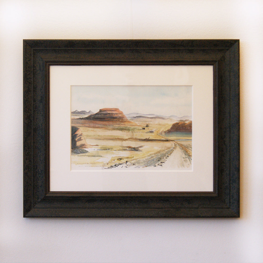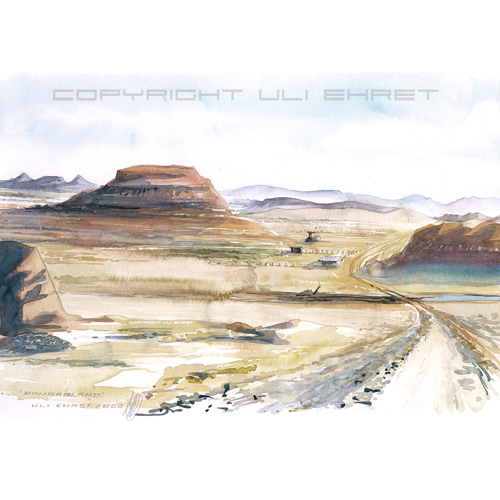 Das Aquarell stellt unsere Fahrt zwischen Twyffelfontein und dem Eingang zum Skelettküsten-Nationalpark dar. Hierbei durchquert man das Damaraland, in dem Twyffelfontein liegt. Der Blick zeigt die Kategorie C Straße, eine gut befahrbare Schotterpiste, die an vielen Stellen gut planiert war. Im Damaraland war ursprünglich Viehzucht möglich. Doch hat die anhaltende Dürre der letzten beiden Jahrzehnte das Land jeglicher, planbarer Fruchtbarkeit beraubt. Auf den etwa 260 km kamen wir an zahllosen verlassenen Farmen und Gemeinden vorbei. Einsame Menschen sah man hier und da. Alle schienen eher zu darben, als zu leben.