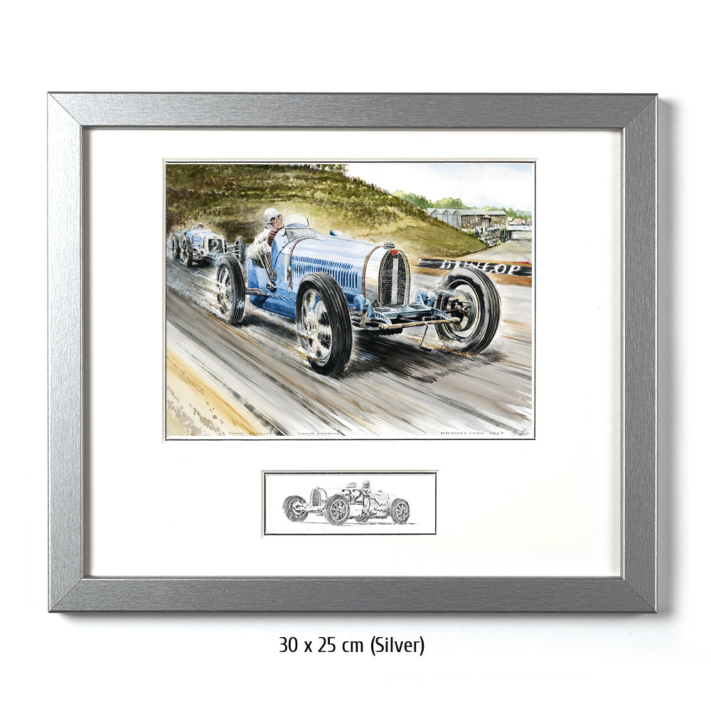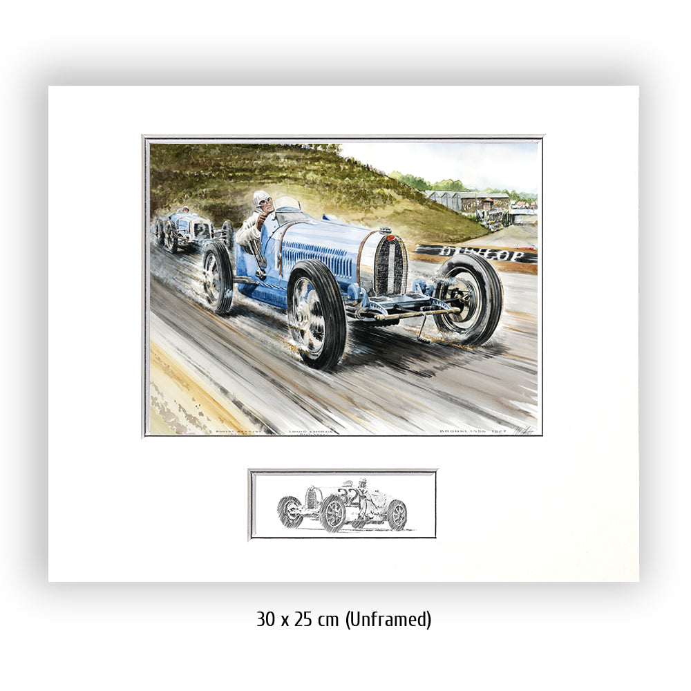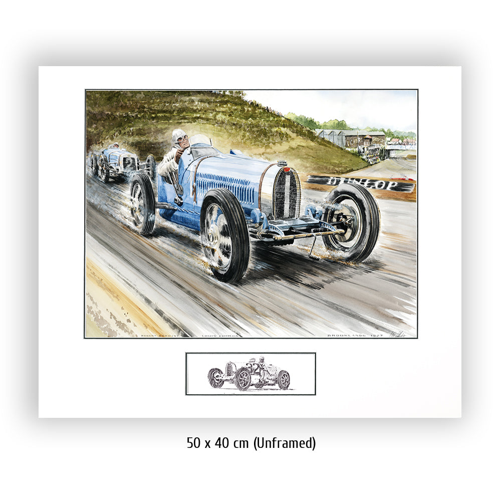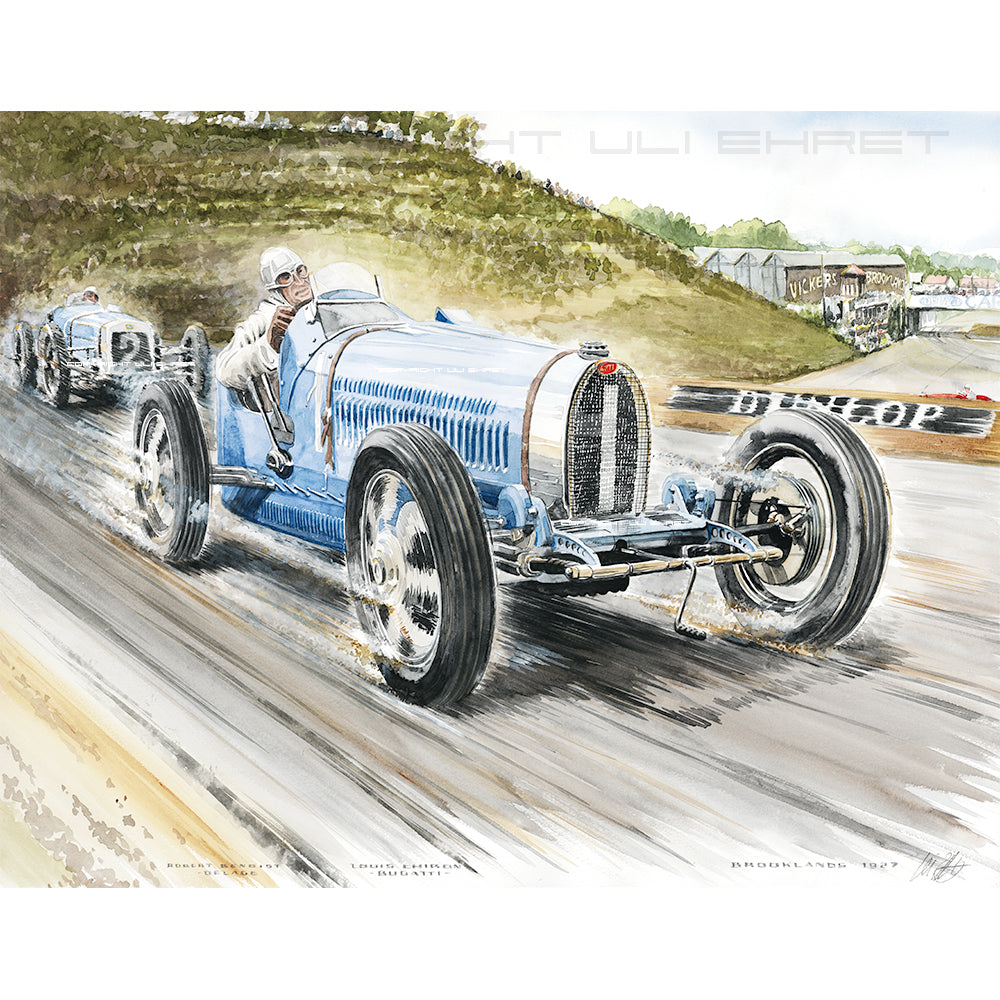 Louis Chiron jagt ein Delage Trio während des Britischen Grand Prix 1927 in Brooklands. Mit dem neuen 1,5 Liter Bugatti Typ 39A war es überhaupt erst der zweite Grand Prix für den Monegassen in seiner langen, 35jährigen Rennfahrerkarriere. Bestens bekannt als der „alte Fuchs“, war Chiron, zusammen mit Anthony Noghès, verantwortlich für die allererste Ausrichtung des GP von Monaco 1929.