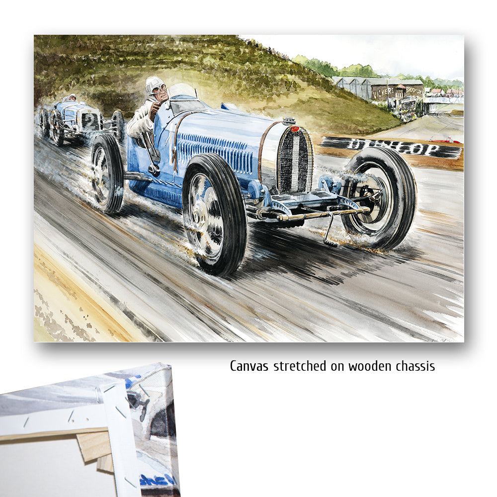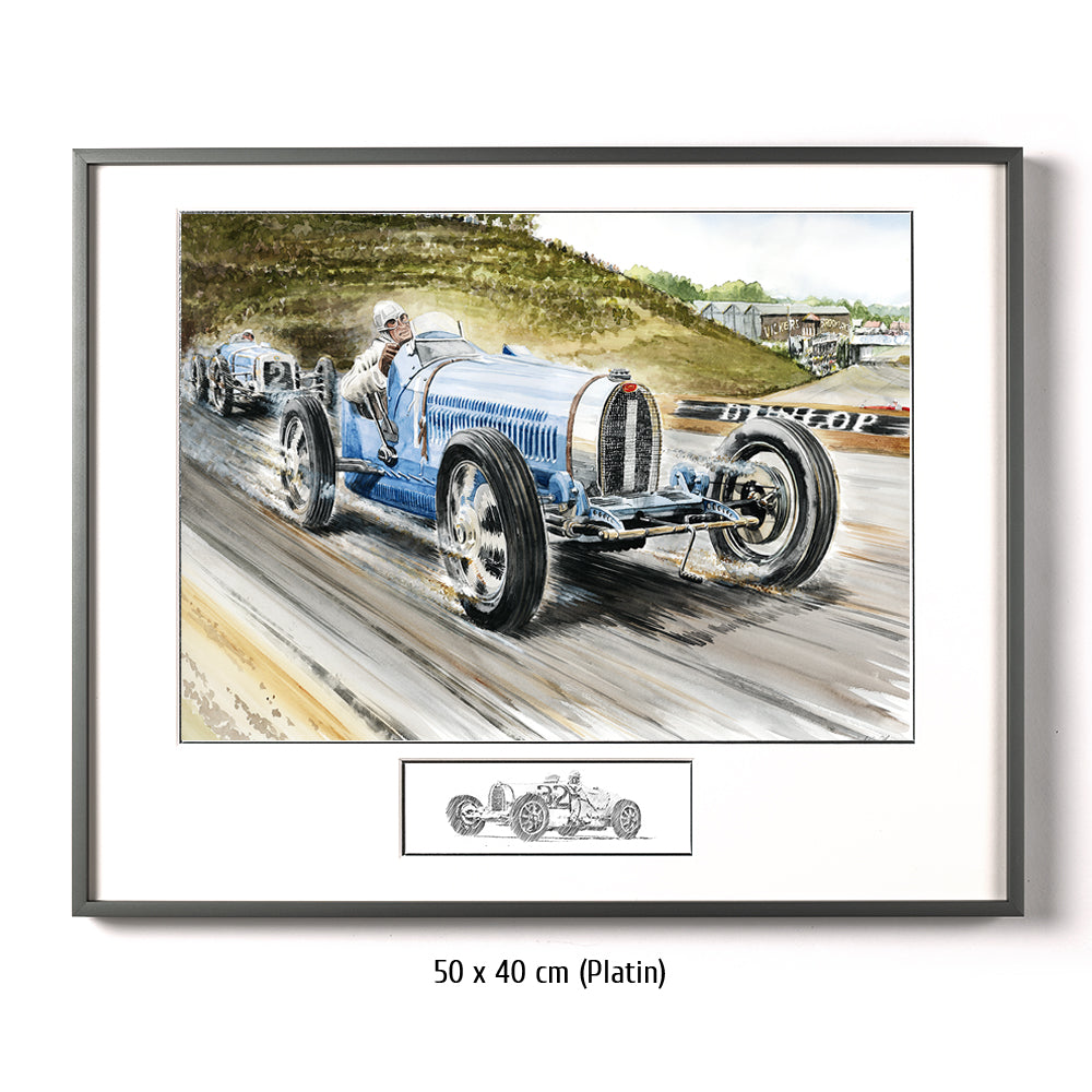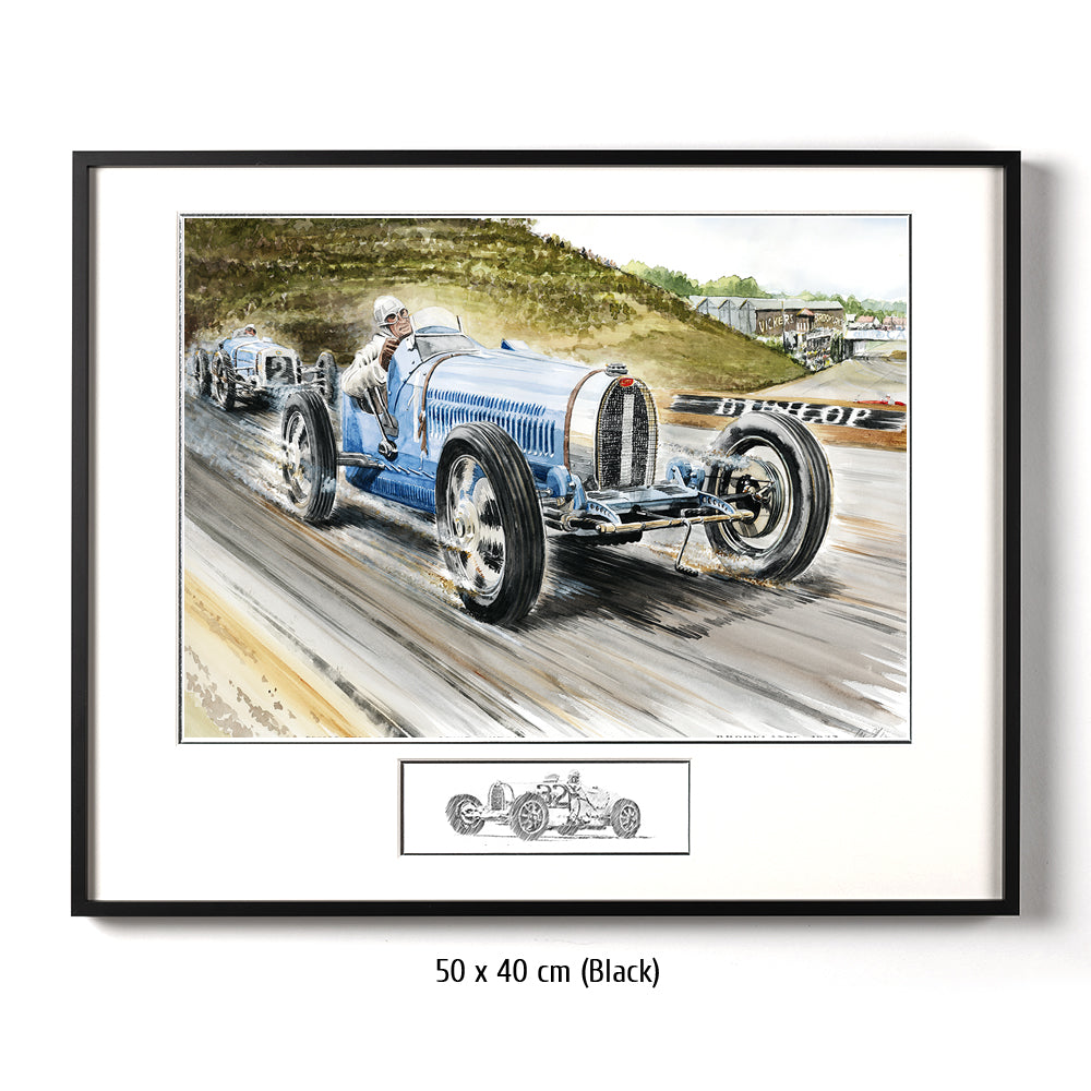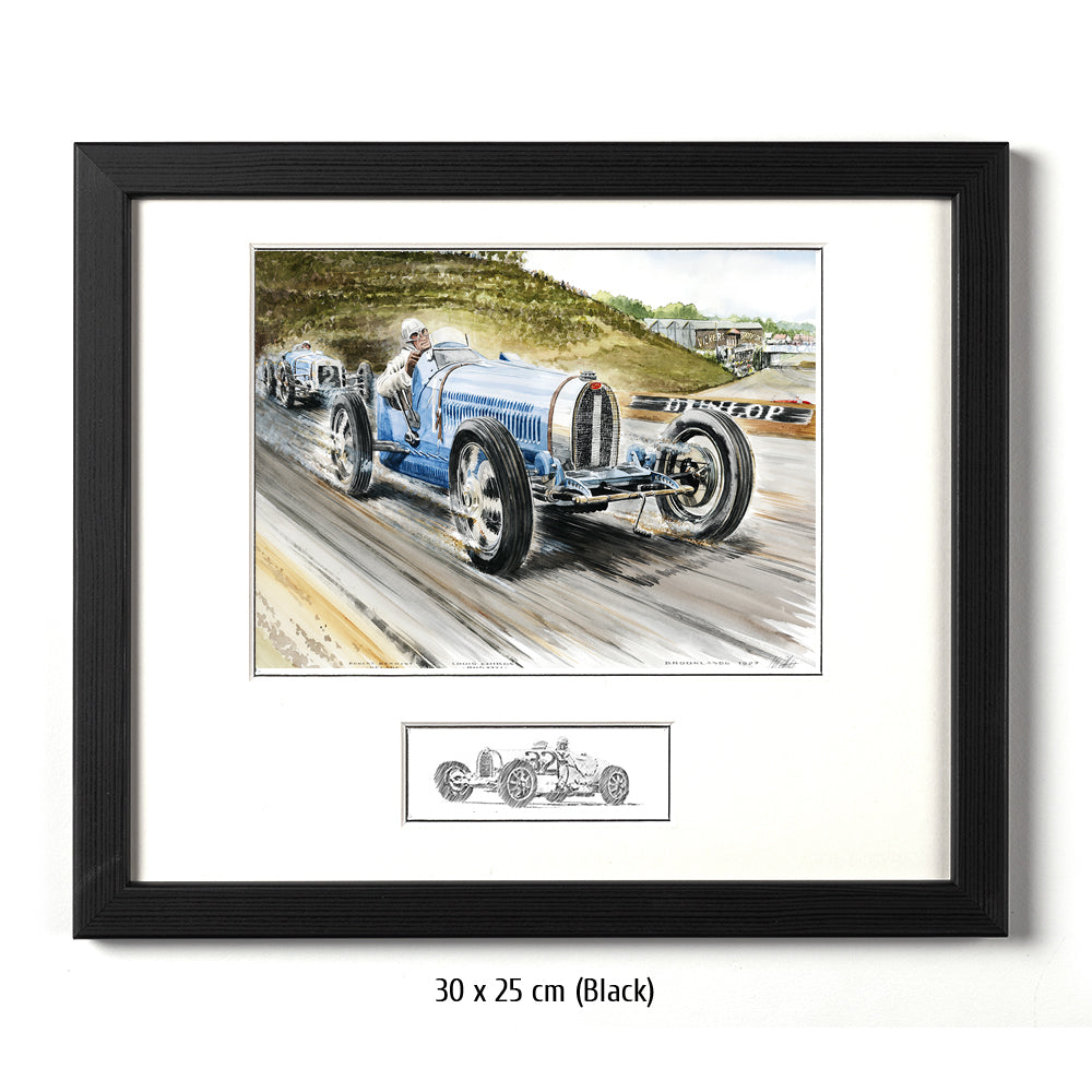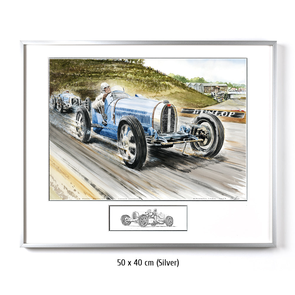 Louis Chiron jagt ein Delage Trio während des Britischen Grand Prix 1927 in Brooklands. Mit dem neuen 1,5 Liter Bugatti Typ 39A war es überhaupt erst der zweite Grand Prix für den Monegassen in seiner langen, 35jährigen Rennfahrerkarriere. Bestens bekannt als der „alte Fuchs“, war Chiron, zusammen mit Anthony Noghès, verantwortlich für die allererste Ausrichtung des GP von Monaco 1929.