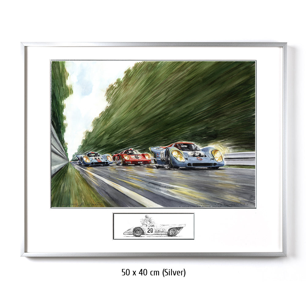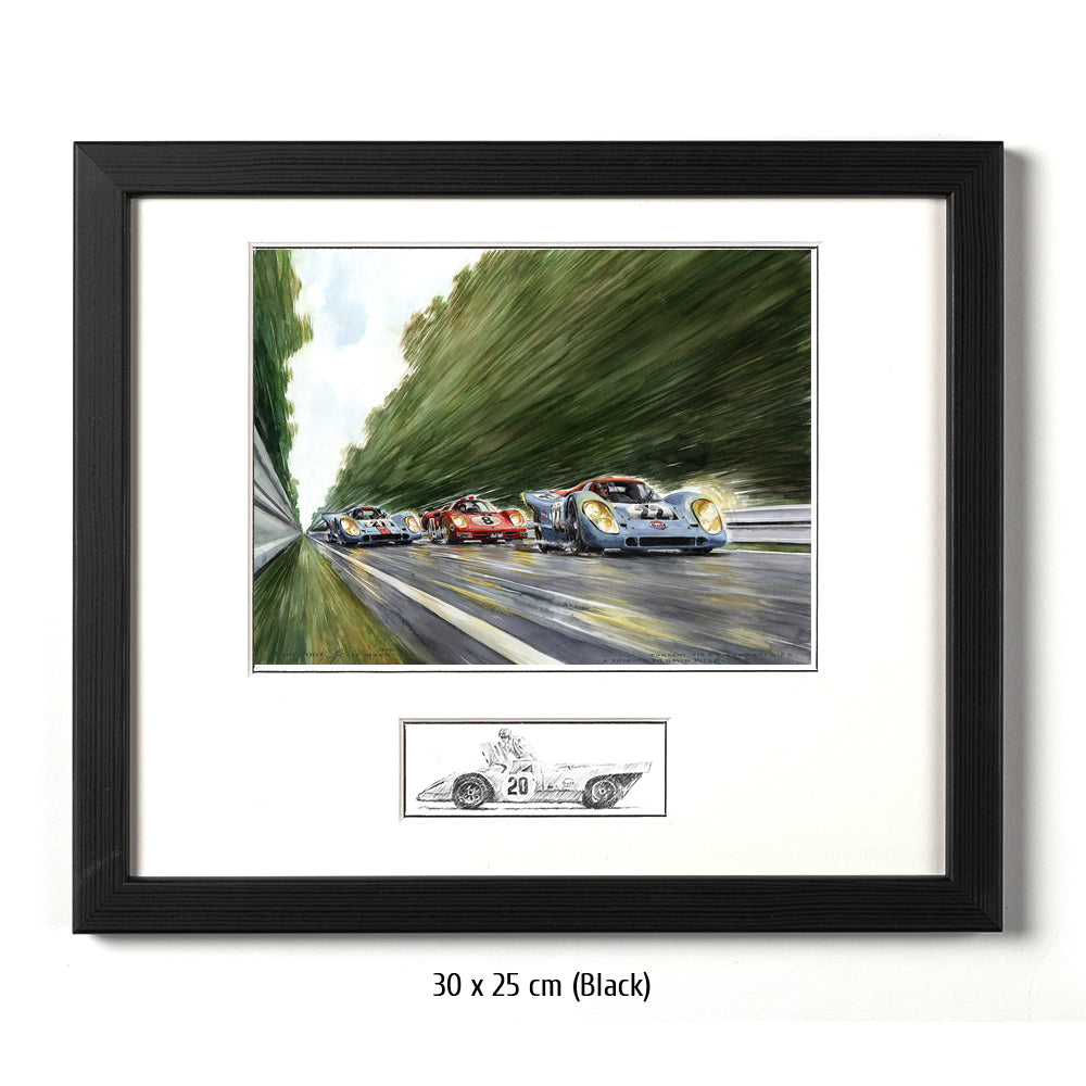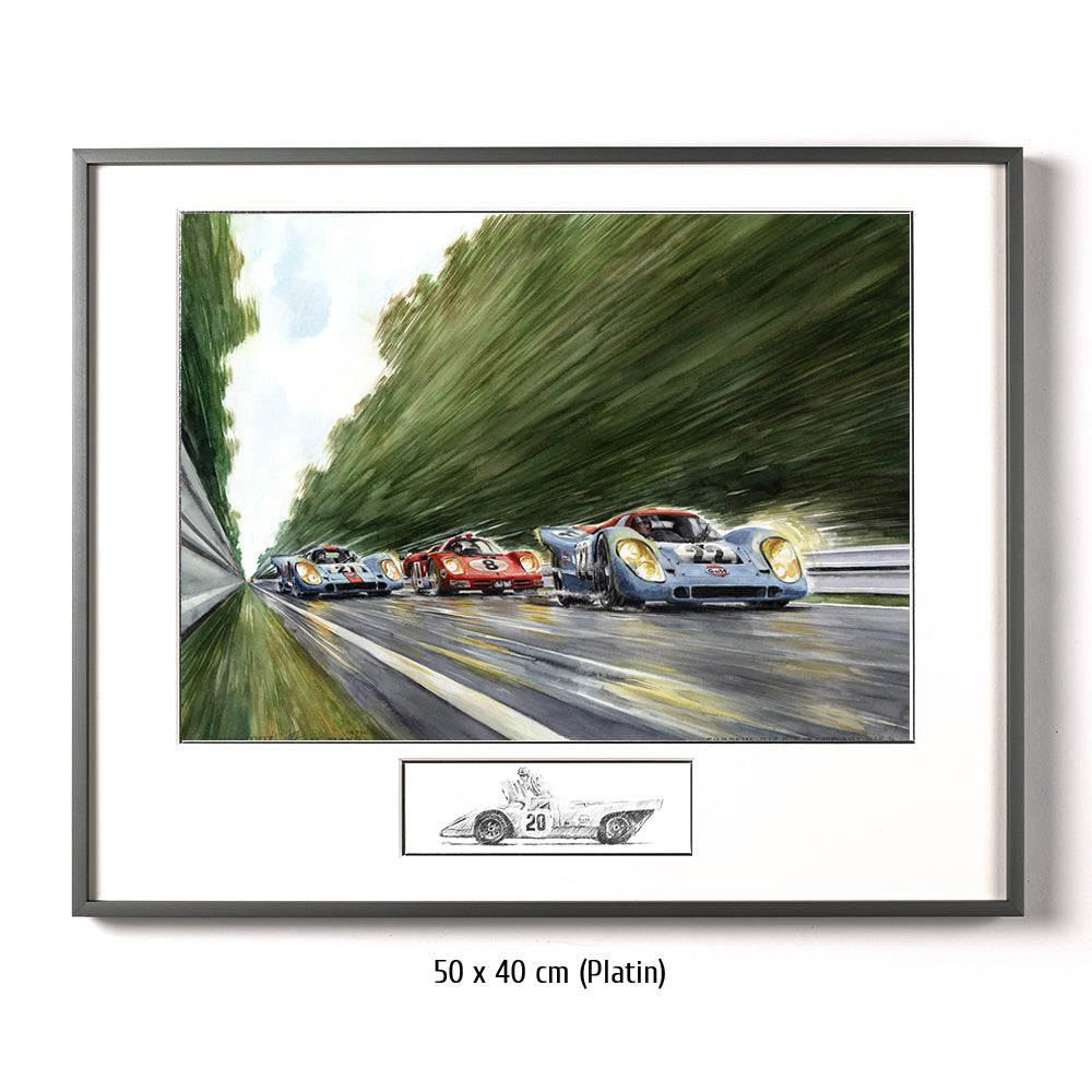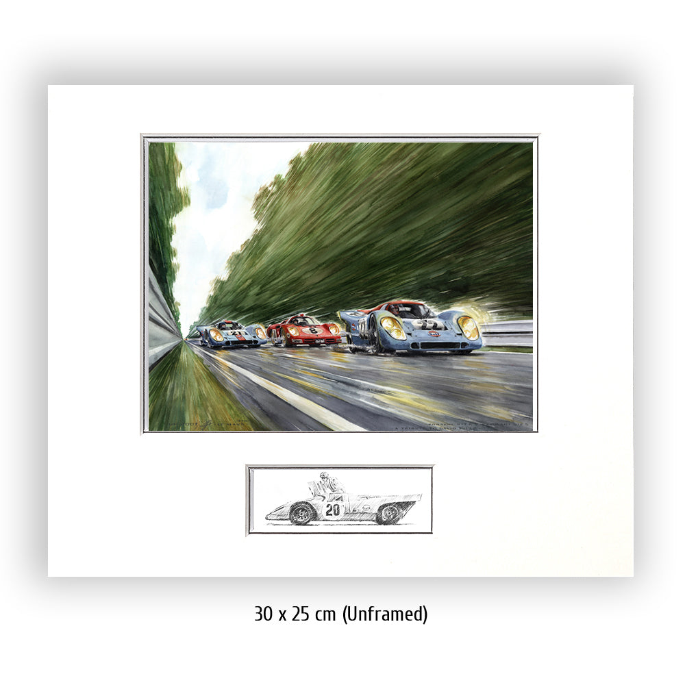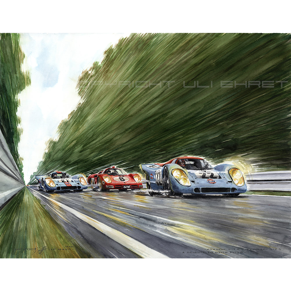 Der vielleicht berühmteste Sportwagen aller Zeiten rast von der Arnage-Kurve kommend auf die Porschekurven zu. Nicht ein einziger der von John Wyer geführten, gulffarbenen Porsche 917 wird 1970 über die gesamte Distanz kommen, aber Dank Hollywood und Steve McQueen wird den 917 in Gulffarben eine Legende zugeschrieben, die für Le Mans 1970 nicht den Fakten entspricht. Der 917 #20 hat im Film einen Unfall. David Piper verliert bei den Stunts während der Dreharbeiten dazu ein Bein, da er die Unfallszene in den Porschekurven zuheftig ausführt. Die gemalte Szene in Uli Ehrets Aquarell zeigt aber die letzte Runde im Film, als McQueen in den 917 #21 umgestiegen ist und „Erich Stahler“ blockiert, damit der führende Porsche #22 zum Sieg kommt.
