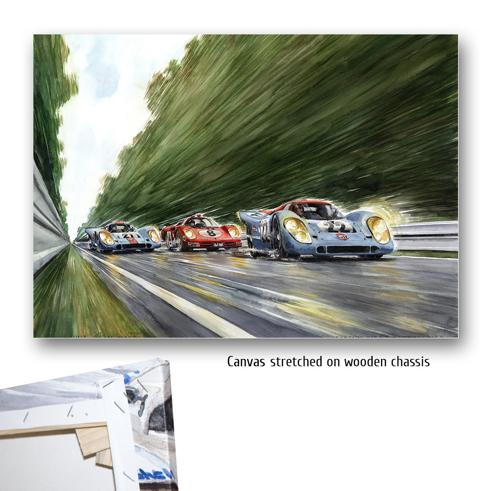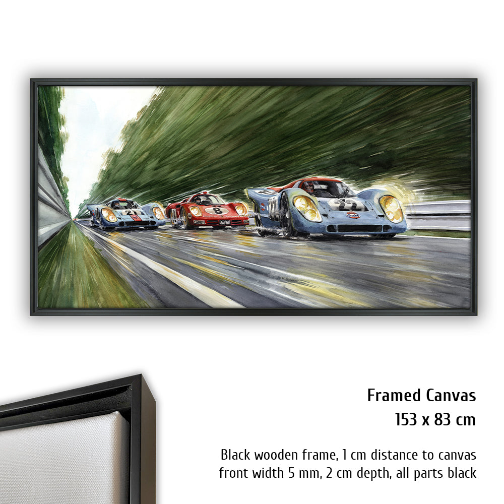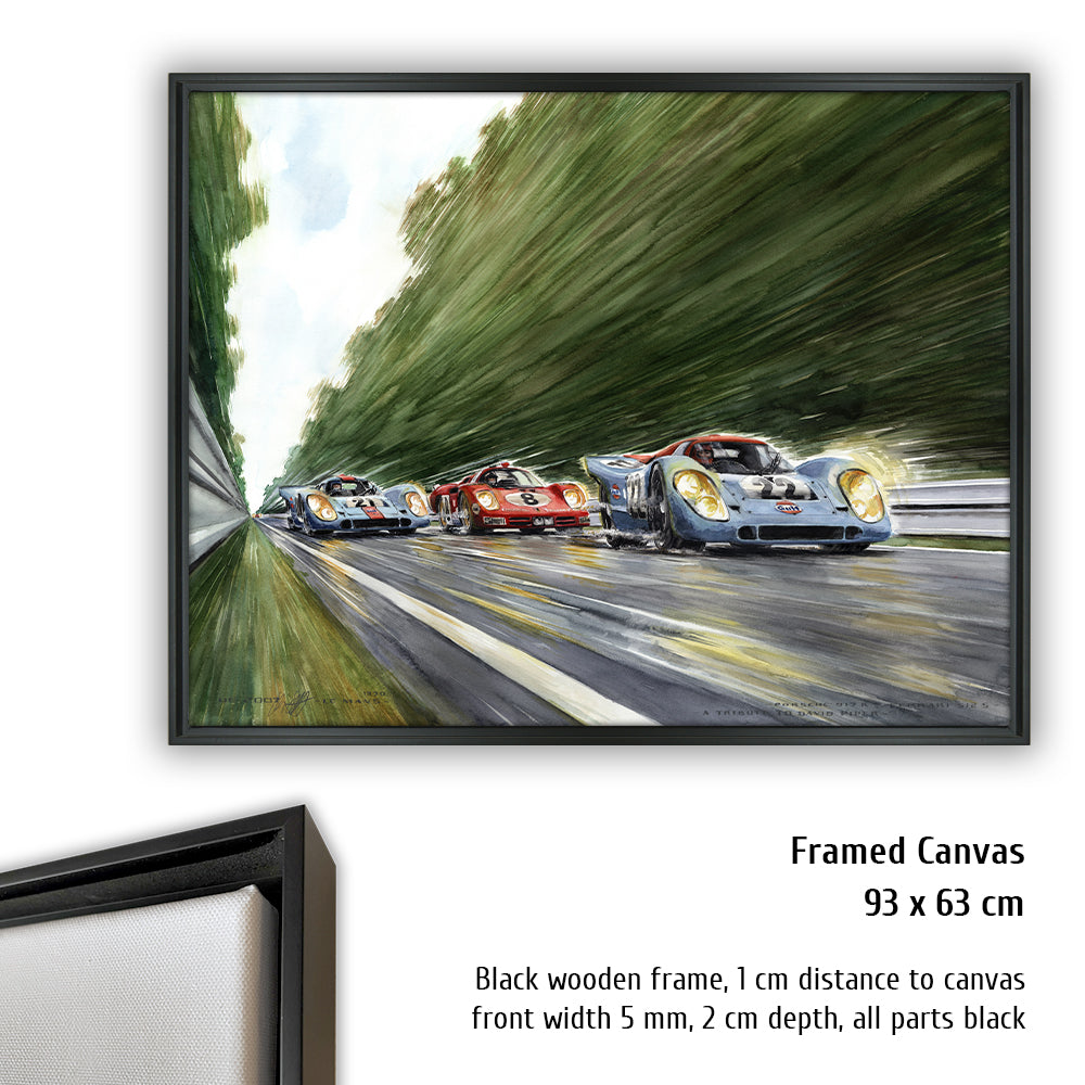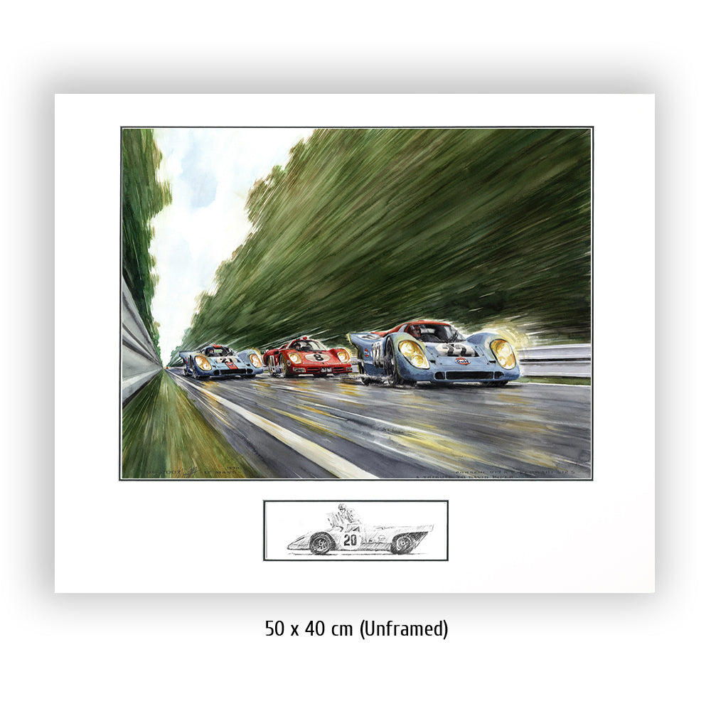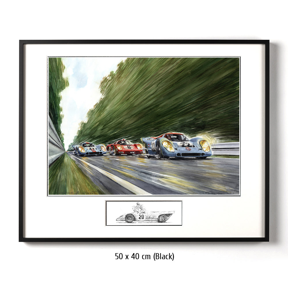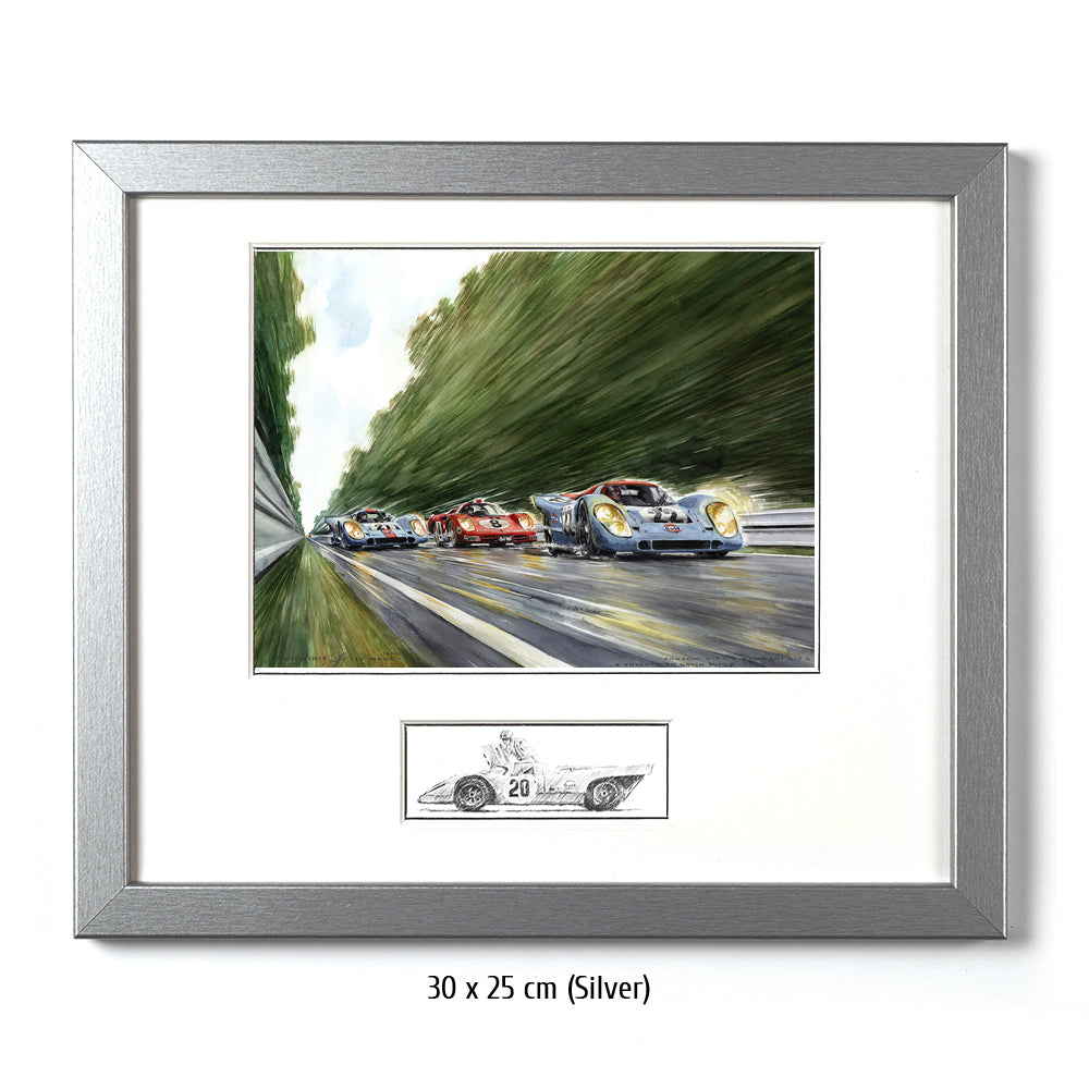 Der vielleicht berühmteste Sportwagen aller Zeiten rast von der Arnage-Kurve kommend auf die Porschekurven zu. Nicht ein einziger der von John Wyer geführten, gulffarbenen Porsche 917 wird 1970 über die gesamte Distanz kommen, aber Dank Hollywood und Steve McQueen wird den 917 in Gulffarben eine Legende zugeschrieben, die für Le Mans 1970 nicht den Fakten entspricht. Der 917 #20 hat im Film einen Unfall. David Piper verliert bei den Stunts während der Dreharbeiten dazu ein Bein, da er die Unfallszene in den Porschekurven zuheftig ausführt. Die gemalte Szene in Uli Ehrets Aquarell zeigt aber die letzte Runde im Film, als McQueen in den 917 #21 umgestiegen ist und „Erich Stahler“ blockiert, damit der führende Porsche #22 zum Sieg kommt.