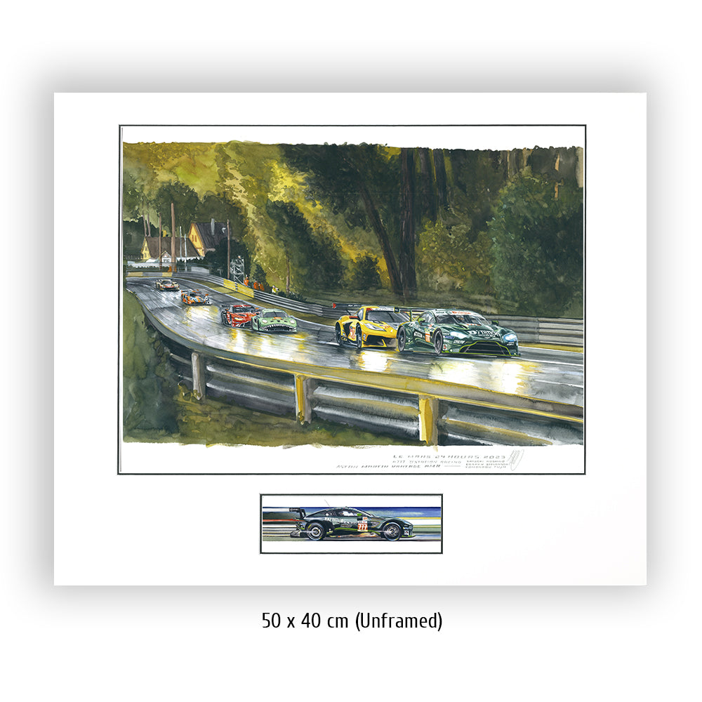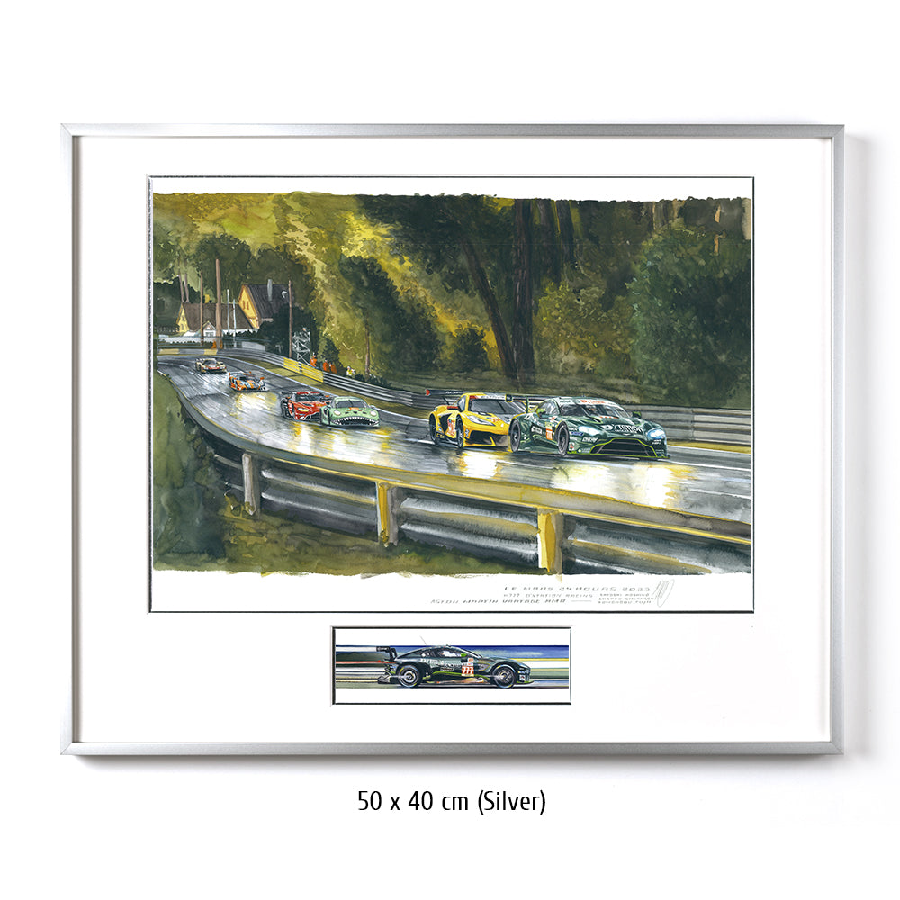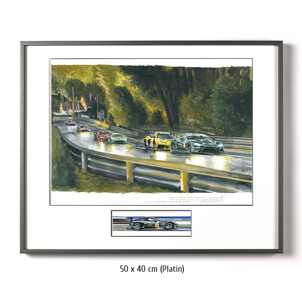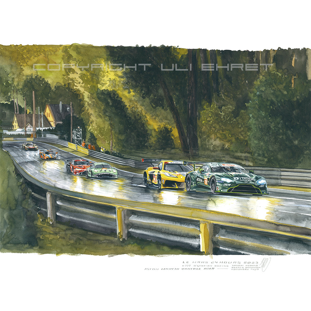 Tomonobu Fujii führt die GTE Meute durch die Waldsektion der Le Mans Rennstrecke. Im Jahr 2023 sind die Wälder zwischen der zweiten Schikane der Hunaudières und der Indianapoliskurve zu einem sehr hohen Baumbestand angewachsen. In ihrem Schatten kämpfen Ben Keating in der Corvette #33 und der TF Sport Aston Martin #777 vom Team D´Station aus Japan gerade um die Platzierung.