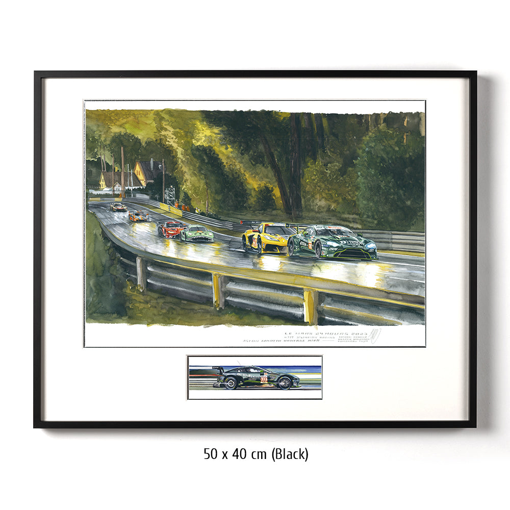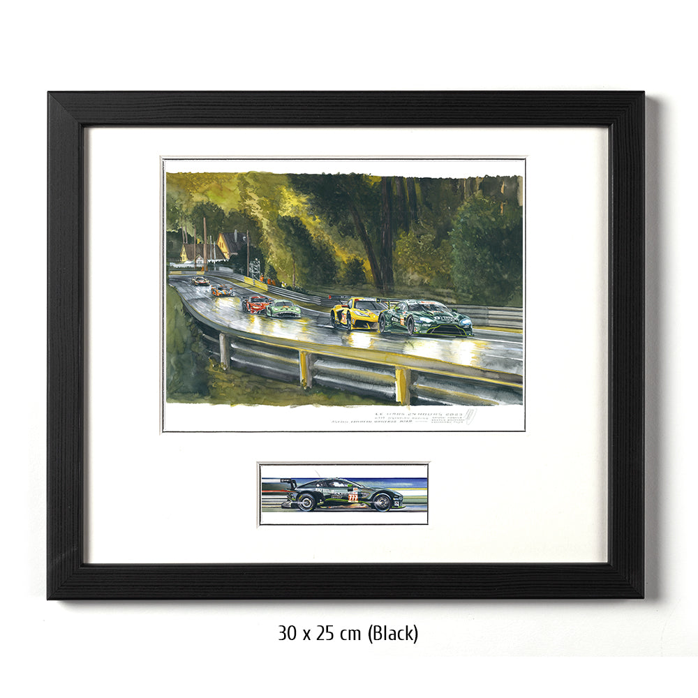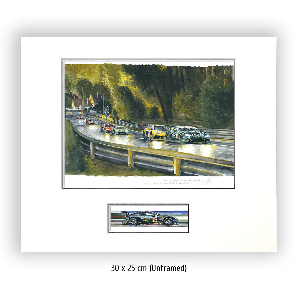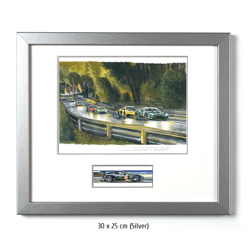 Tomonobu Fujii führt die GTE Meute durch die Waldsektion der Le Mans Rennstrecke. Im Jahr 2023 sind die Wälder zwischen der zweiten Schikane der Hunaudières und der Indianapoliskurve zu einem sehr hohen Baumbestand angewachsen. In ihrem Schatten kämpfen Ben Keating in der Corvette #33 und der TF Sport Aston Martin #777 vom Team D´Station aus Japan gerade um die Platzierung.