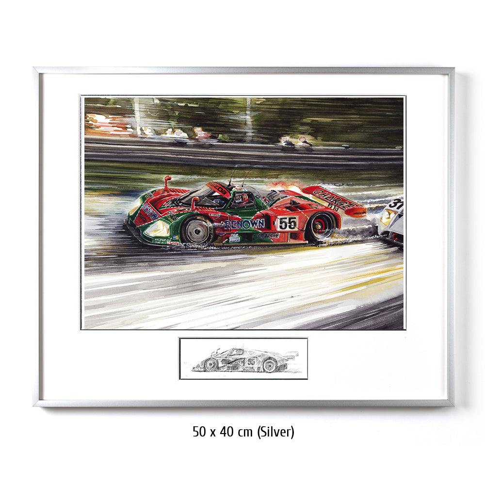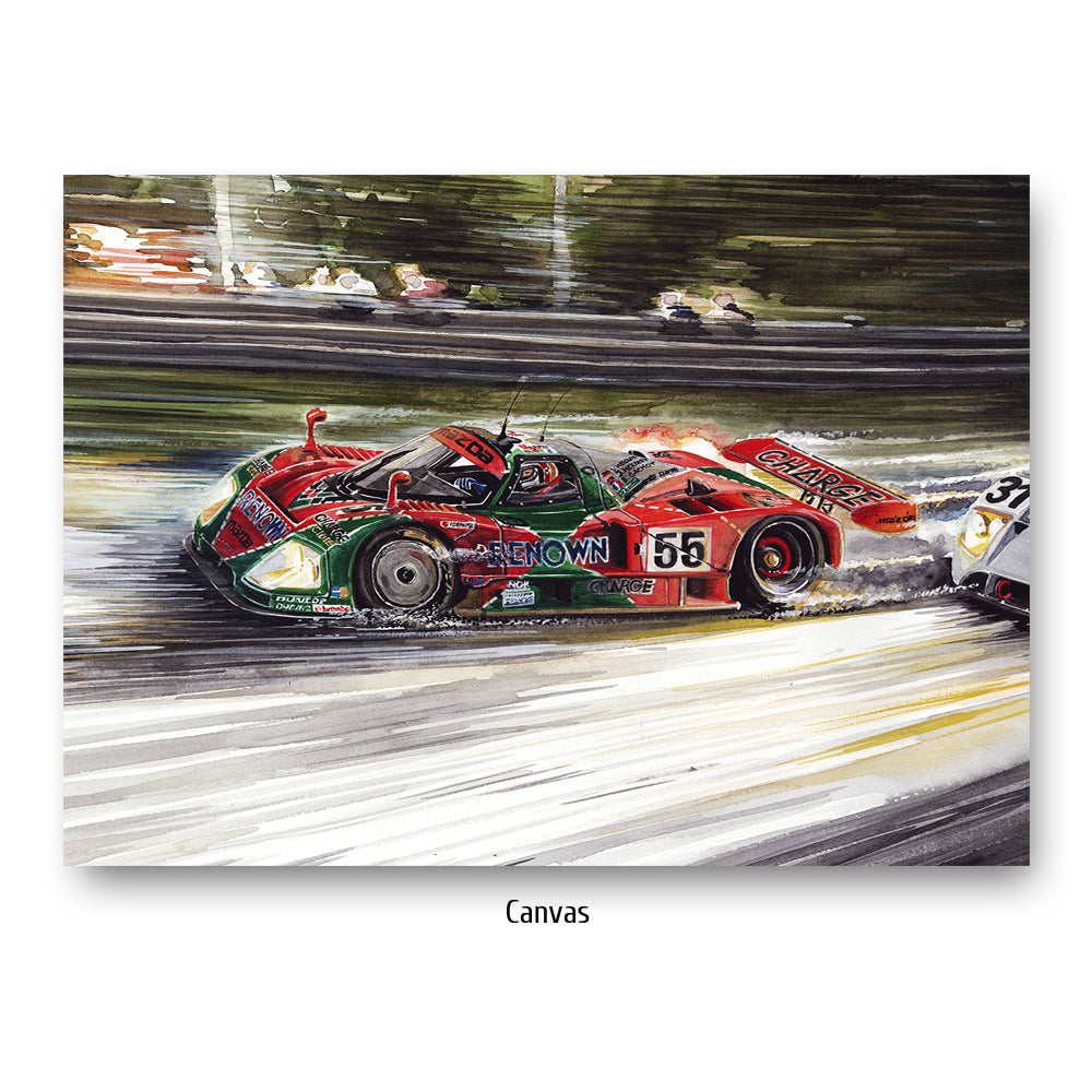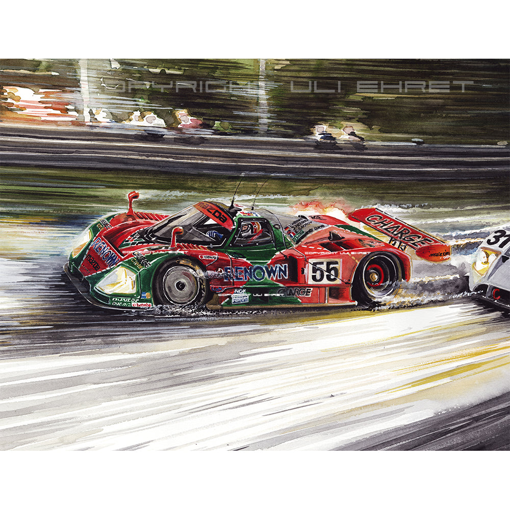 Volker Weidlers Mazda 787 B wird von den Favoriten Mercedes und Jaguar durch den frühen Morgen an der Sarthe gajagt. Je länger das Rennen anhielt, desto deutlicher wurde die tatsächliche Chance, dass Mazda dieses Rennen gewinnen kann. Selbst das Team und die drei Fahrer Johnny Herbert, Bertrand Gachot und Volker Weidler konnten Ihren Augen nicht trauen, als sie von Startplatz 12 aus in der Tabelle kontinuierlich nach oben stiegen, um tatsächlich zu führen und letztendlich zu gewinnen. Bis heute der einzige Sieg eines japanischen Wagens und eines Wankelmotors.