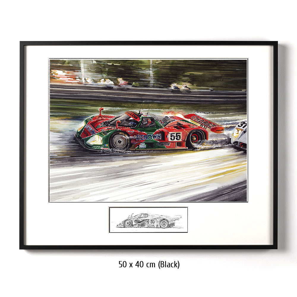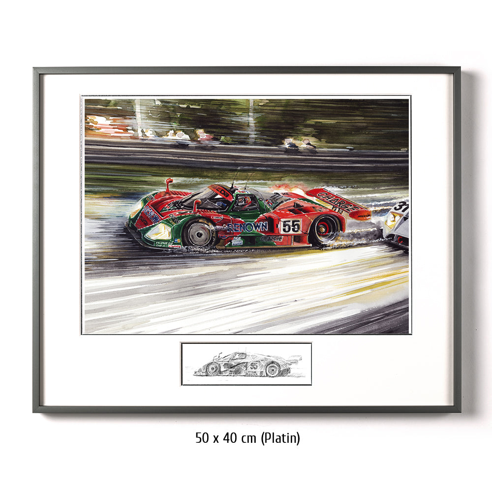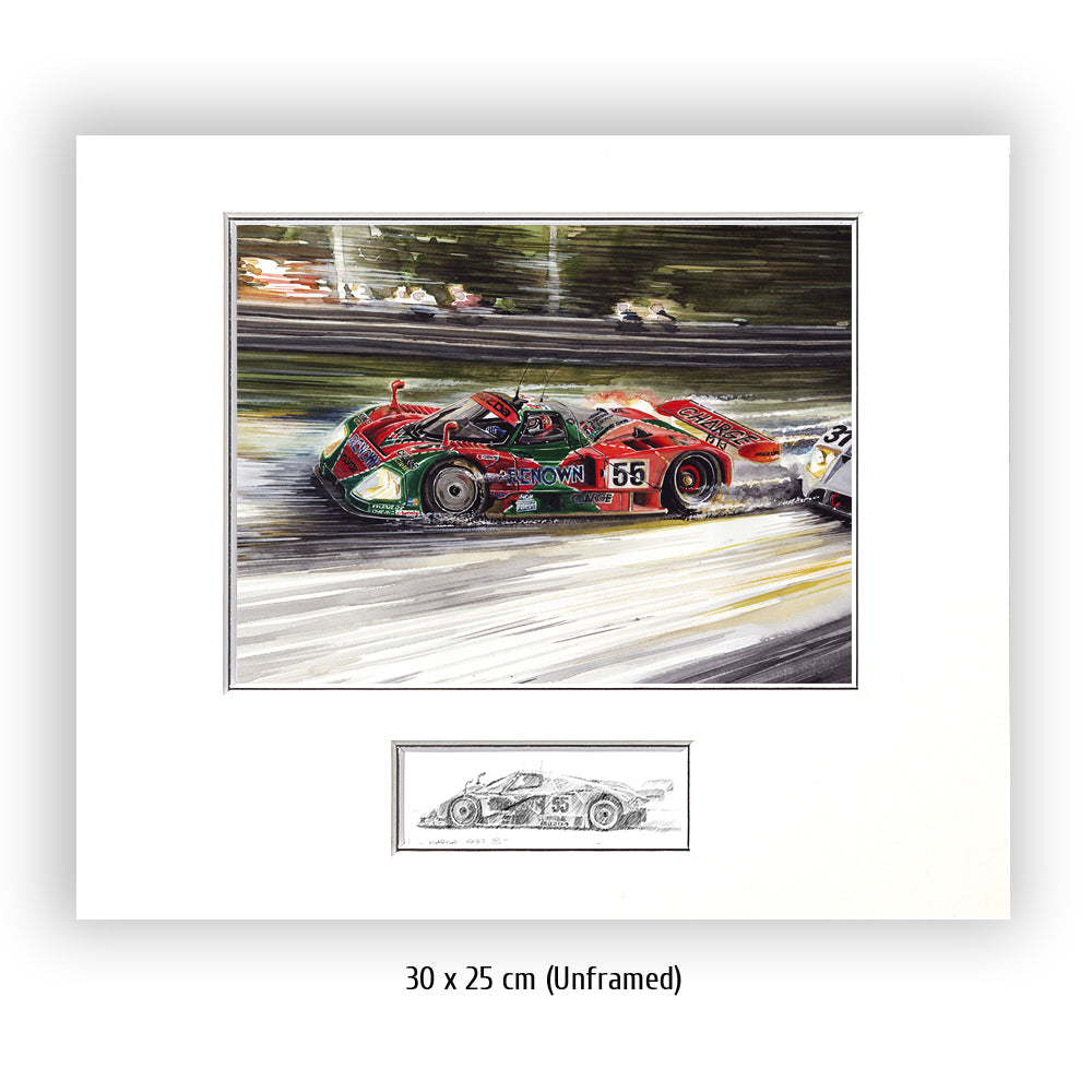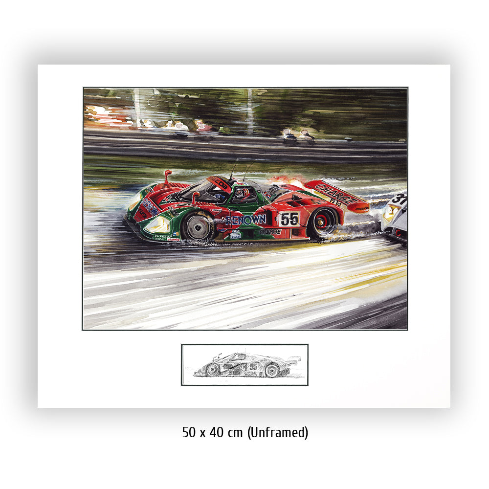 Volker Weidlers Mazda 787 B wird von den Favoriten Mercedes und Jaguar durch den frühen Morgen an der Sarthe gajagt. Je länger das Rennen anhielt, desto deutlicher wurde die tatsächliche Chance, dass Mazda dieses Rennen gewinnen kann. Selbst das Team und die drei Fahrer Johnny Herbert, Bertrand Gachot und Volker Weidler konnten Ihren Augen nicht trauen, als sie von Startplatz 12 aus in der Tabelle kontinuierlich nach oben stiegen, um tatsächlich zu führen und letztendlich zu gewinnen. Bis heute der einzige Sieg eines japanischen Wagens und eines Wankelmotors.