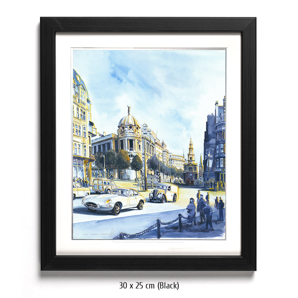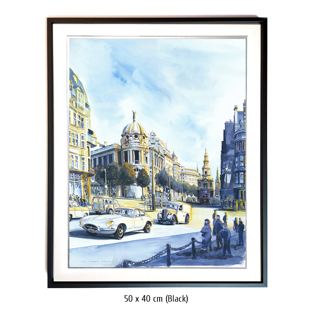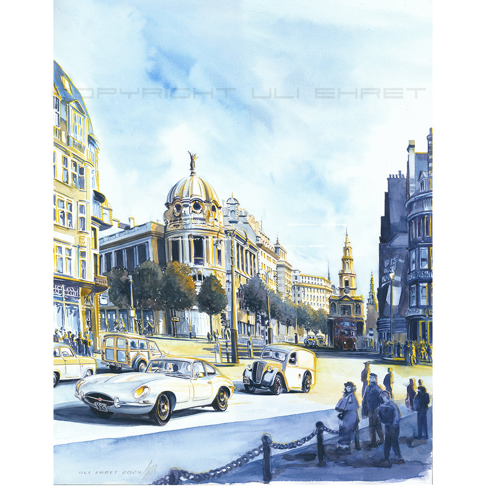 Ein Jaguar E-Type fährt am frühen Morgen durch den Vorort Soho in London.