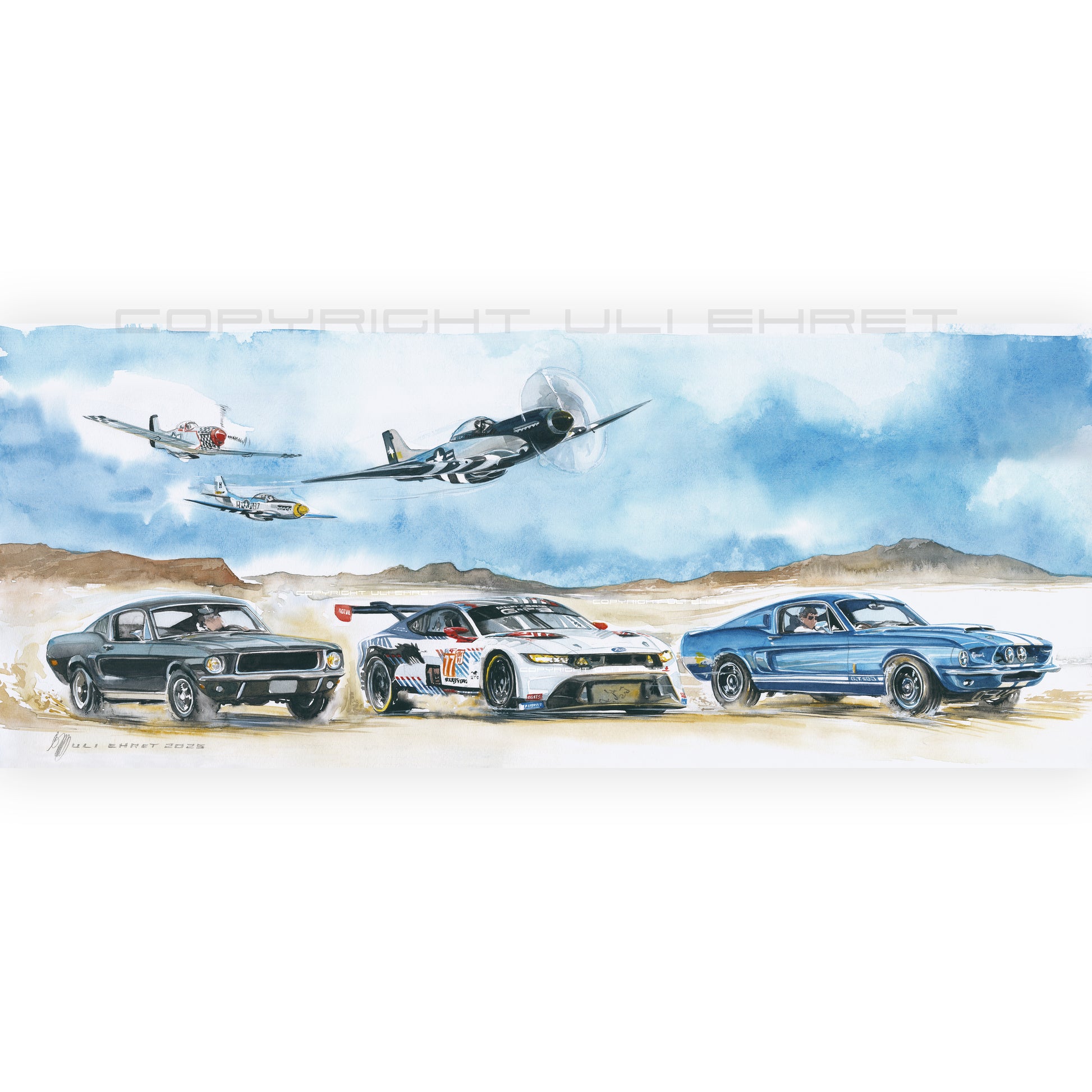 Drei North American P51 Mustang in der Luft über einer typisch nordamerikanischen Landschaft