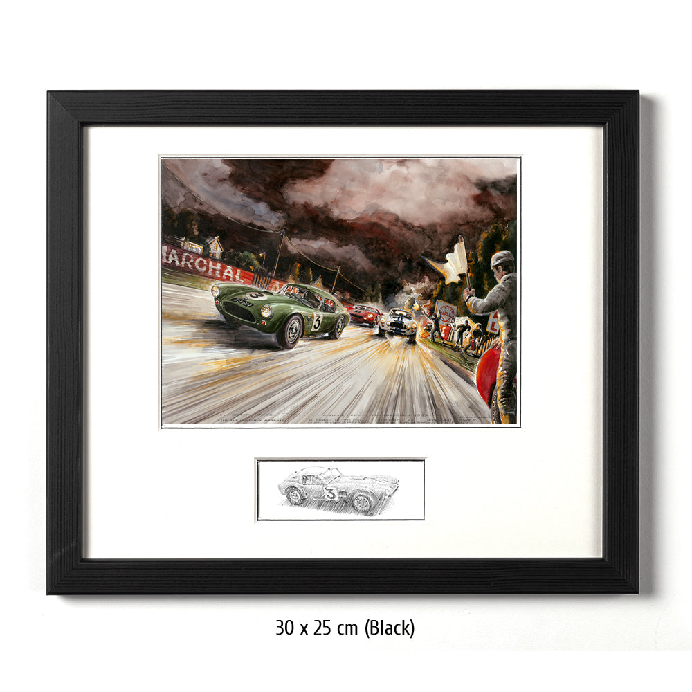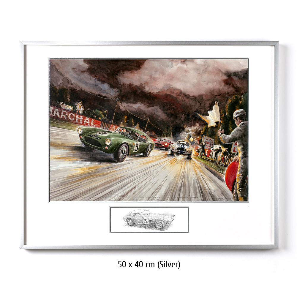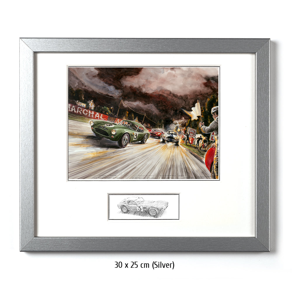 Die AC Cobra mit der Startnummer 3 von Bolton und Sanderson kämpft sich durch alle Unbillen des 31. Grand Prix d´Endurance, dem 24 Stundenrennen von Le Mans. Selbst dunkelste Nacht, grell brennende Fahrzeuge am Straßenrand und heldenhaft agierende Streckenposten können das Team nicht stoppen. Die Cobra #3 erreichte den 7. Platz im Gesamtklassement – und das bei seinem ersten Aufritt. Nummer 4 schied leider aus. Der Ferrari 275 SP mit Scarfiotti & Bandini, der im Bild gerade zum Überholen ansetzt, siegte bei den 24 Stunden von Le Mans 1963 vor weiteren Ferrari Teamkollegen.
