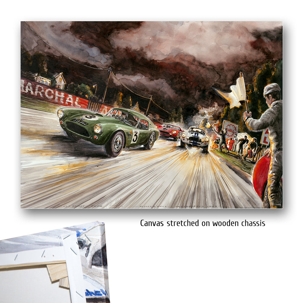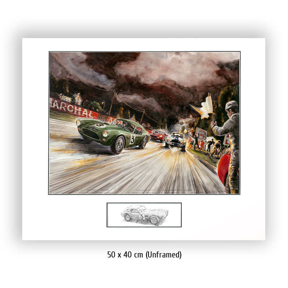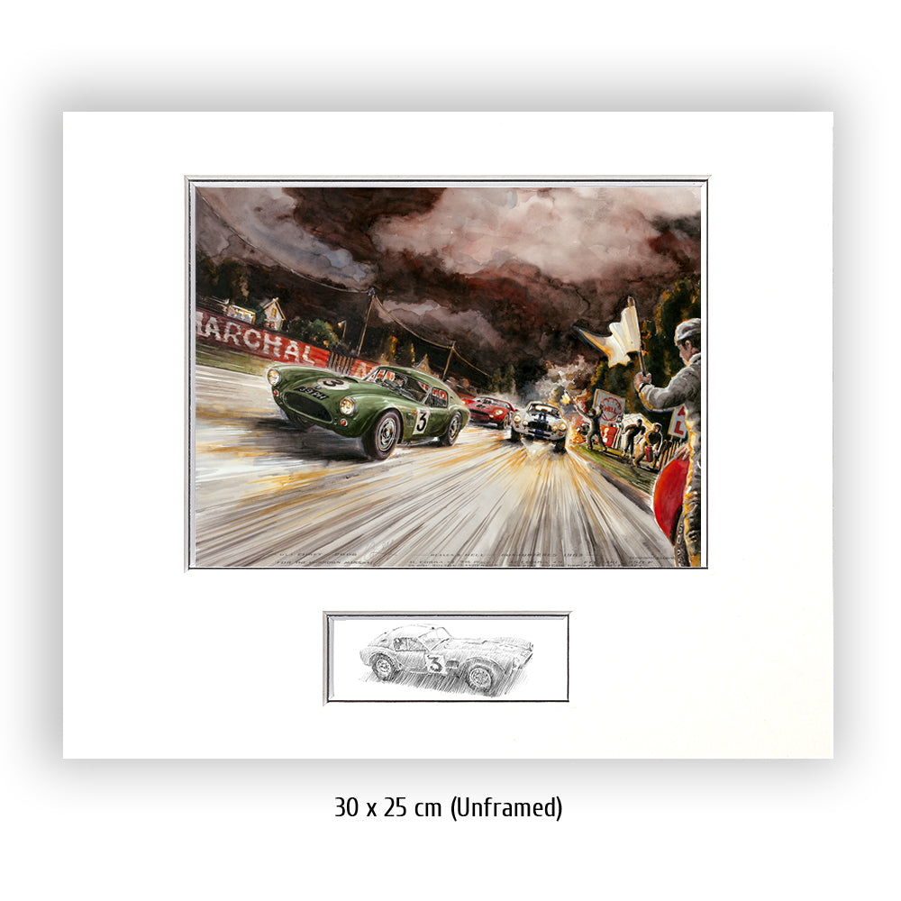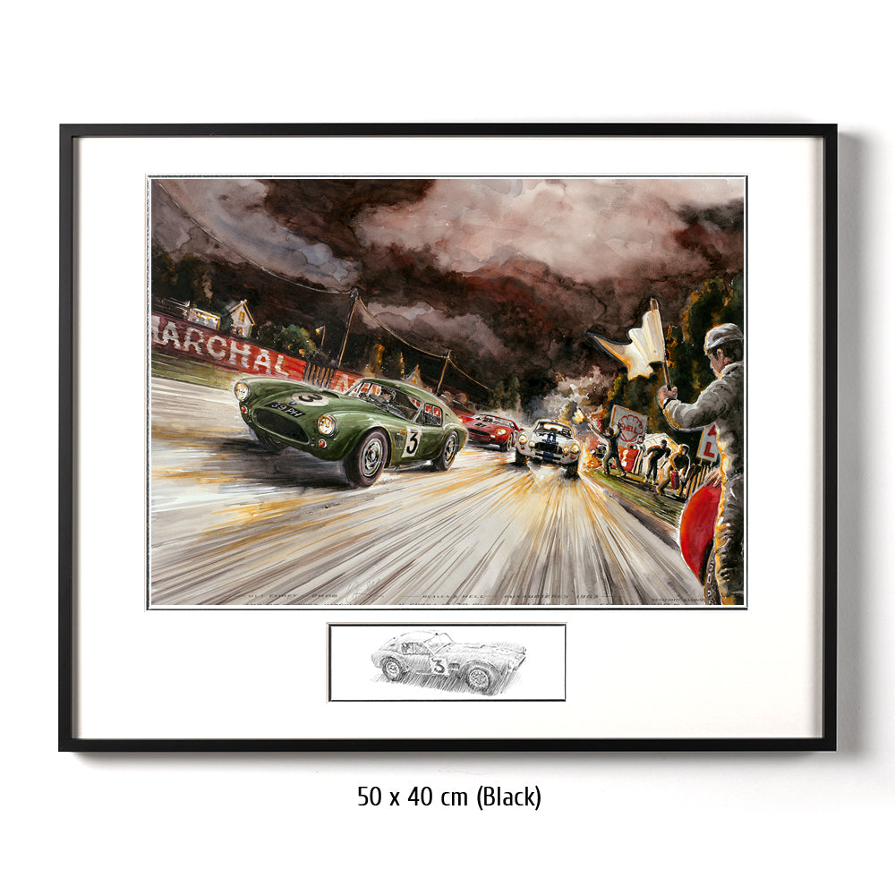 Die AC Cobra mit der Startnummer 3 von Bolton und Sanderson kämpft sich durch alle Unbillen des 31. Grand Prix d´Endurance, dem 24 Stundenrennen von Le Mans. Selbst dunkelste Nacht, grell brennende Fahrzeuge am Straßenrand und heldenhaft agierende Streckenposten können das Team nicht stoppen. Die Cobra #3 erreichte den 7. Platz im Gesamtklassement – und das bei seinem ersten Aufritt. Nummer 4 schied leider aus. Der Ferrari 275 SP mit Scarfiotti & Bandini, der im Bild gerade zum Überholen ansetzt, siegte bei den 24 Stunden von Le Mans 1963 vor weiteren Ferrari Teamkollegen.