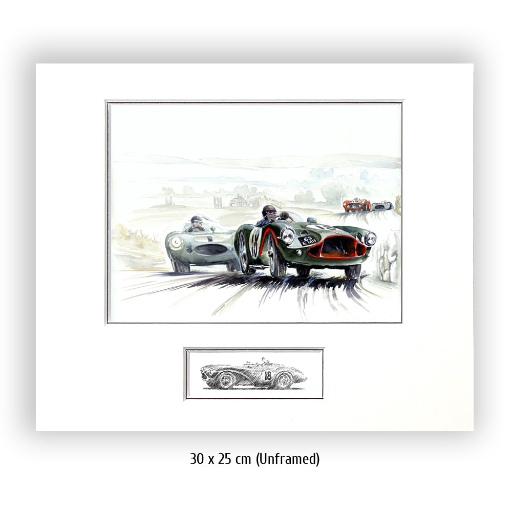 Der Ort Dundrod, westlich von Belfast in Irland, gab dem nahegelegenen 12 Kilometer langen Kurs seinen Namen, auf dem in den 50er Jahren hauptsächlich Langstreckenrennen ausgetragen wurden. Die gefährliche Mischung aus schnellen Landstraßen und engen, von Abschlägen und Straßendeformationen übersähten Sträßchen, plötzlichen Sprüngen und Gräben, testete das Können der Fahrer auf´s Äußerste. Die Abbildung zeigt einen Aston Martin DB3S der von einem driftenden Jaguar D-Type bedrängt wird. Mercedes und Aston testeten in Dundrod 1955 ihr Material und ihre Fahrer. Im Hintergrund sieht man Moss auf einem Mercedes, wie er versucht an Hawthorn im Jaguar „dranzubleiben“.