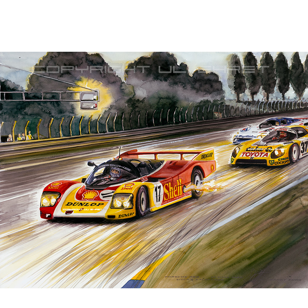 Unter all den wunderschönen von Shell gesponserten Rennwagen, ist der Stuck/Bell/Ludwig 962 von 1988 mit der Schönste. In einer epischen Schlacht durch die Nacht bis zum frühen Morgen hielten Stuck und Bell ihr Auto auf Podiumskurs gegen die starke Jaguar Opposition. Der XJR 9LM zeigte sich am Ende überlegen, aber auch Ludwigs Fehleinschätzung der Benzinreserve half den „Katzen“ zur Führung, nachdem Stuck eine einzigartige Nachtjagd mit ständigen Bestzeiten hingelegt hatte. Es folgt der New Man- / TakaQ-Toyota und ein anderer faszinierender Wagen, der zweite Spice Werkswagen aus der Kategorie C2, die mit dem 962 gerade die Ford-Schikanen anbremsen.