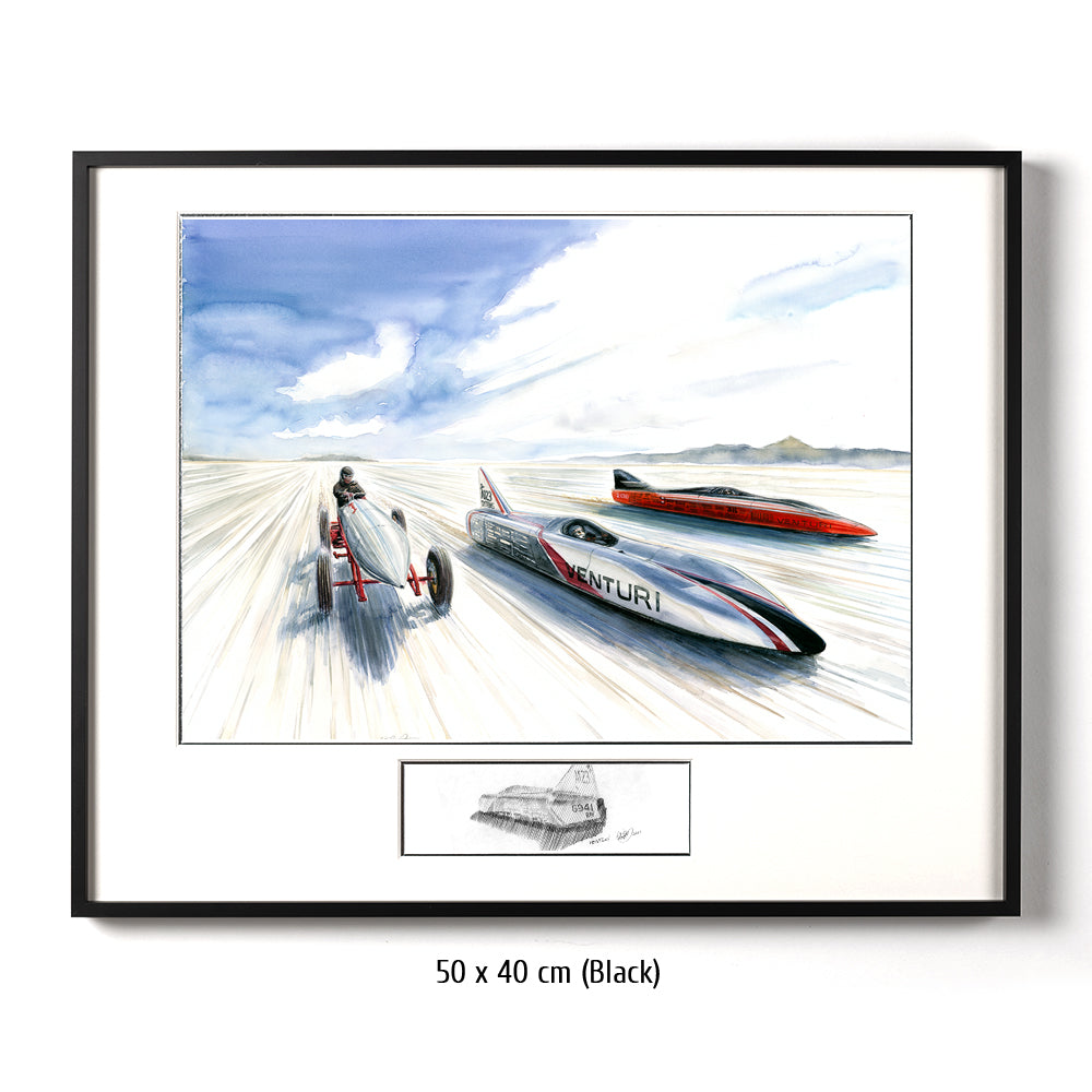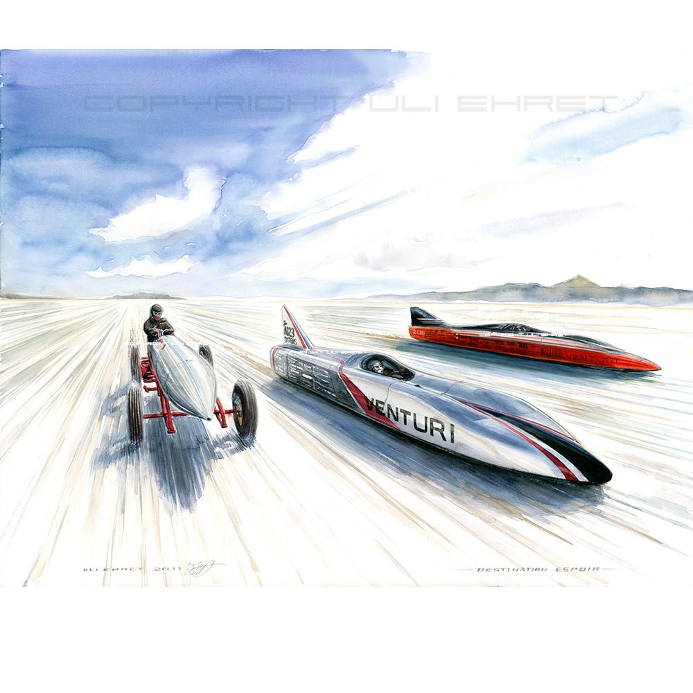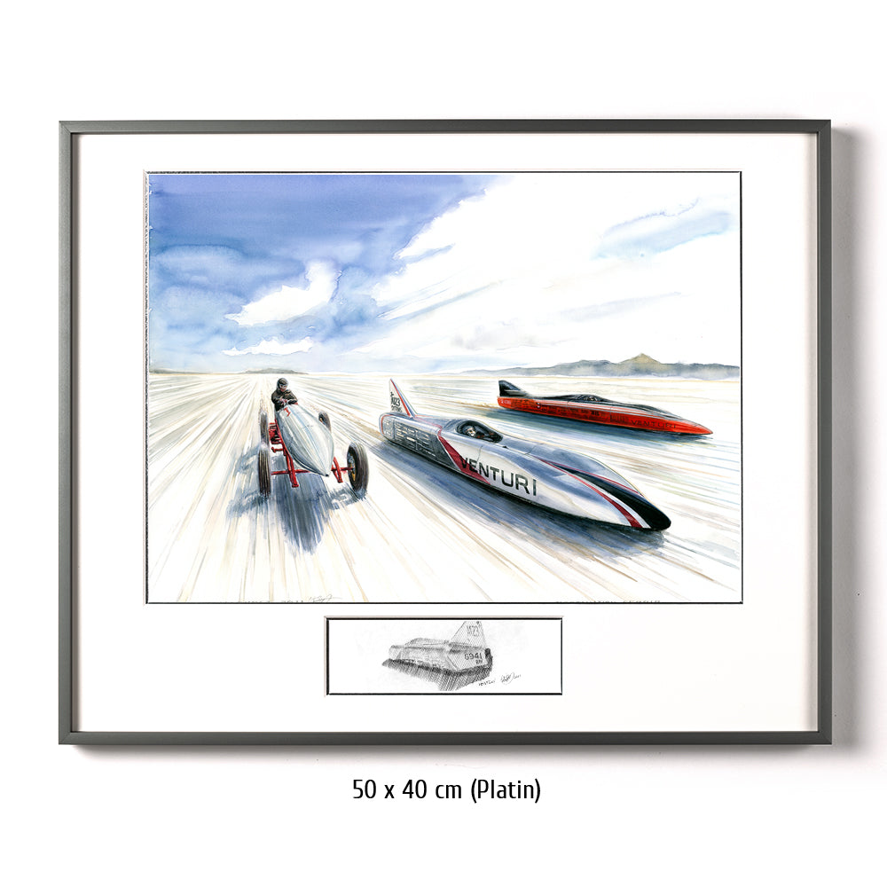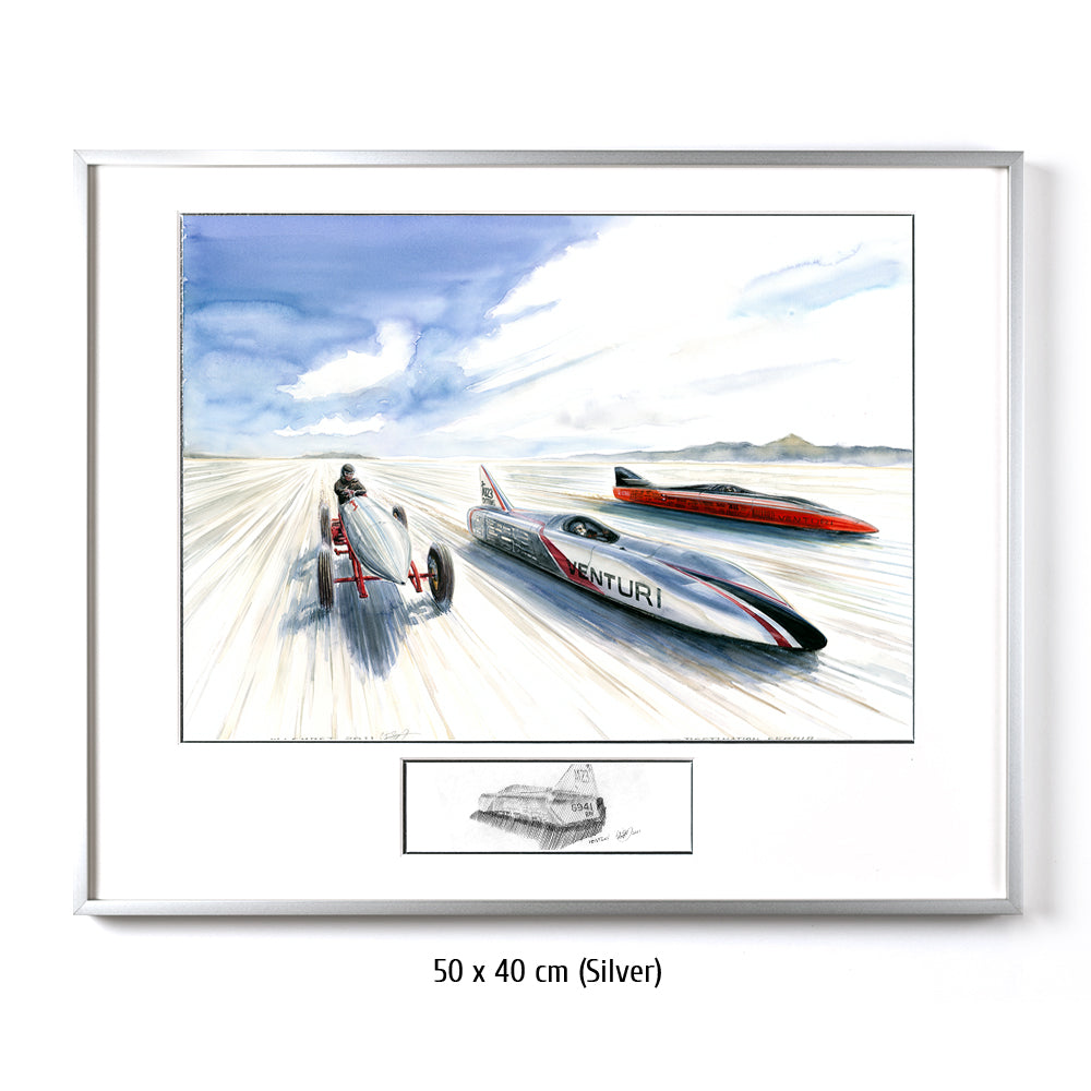 Zwei zeitgenössische Venturi Weltrekordwagen rasen über den Salzsee in Bonneville, Seite an Seite mit einem Vorreiter der Vorzeit des Rennsports. Heute sind batteriebetriebene Wagen keine Herausforderung für ihre düsenbetriebenen Rivalen, aber 1899 konnte Rennfahrer Camille Jenatzy mit der elektrisch betriebenen Jamais Contente den Rekord für sich verbuchen (linkes Fahrzeug im Bild #314). Über ein Jahrhundert später ist Venturi die Speerspitze der Designer und Hersteller von Rekordfahrzeugen mit alternativen Energieantrieben. Buckeye Bullet 2 (rechts im Bild) stellt die Meßlatte für wasserstoffbetriebene Fahrzeuge dar, während sein Stallgefährte, der Buckeye Bullet 2.5 den Rekord für elektrisch betriebene Fahrzeuge hält. Beide können Geschwindigkeiten bis nahezu 500 Stundenkilometer erreichen.