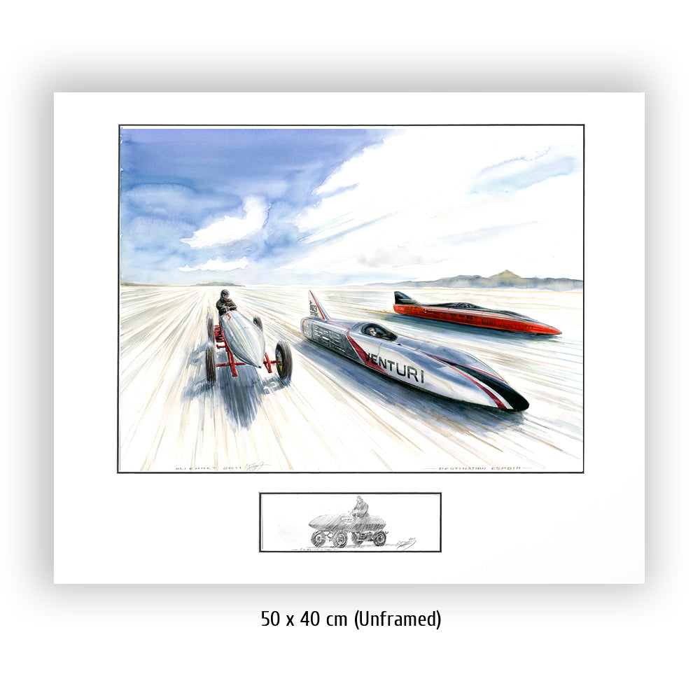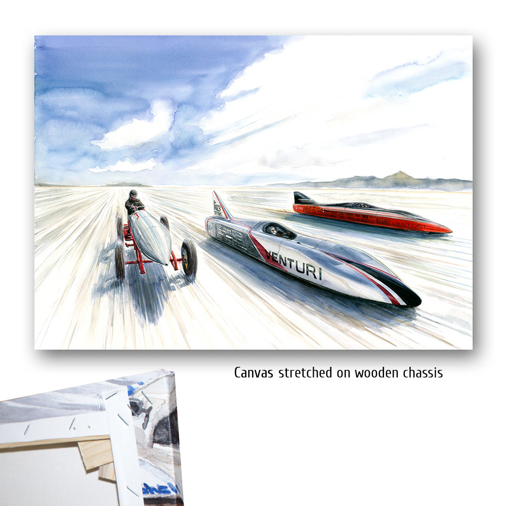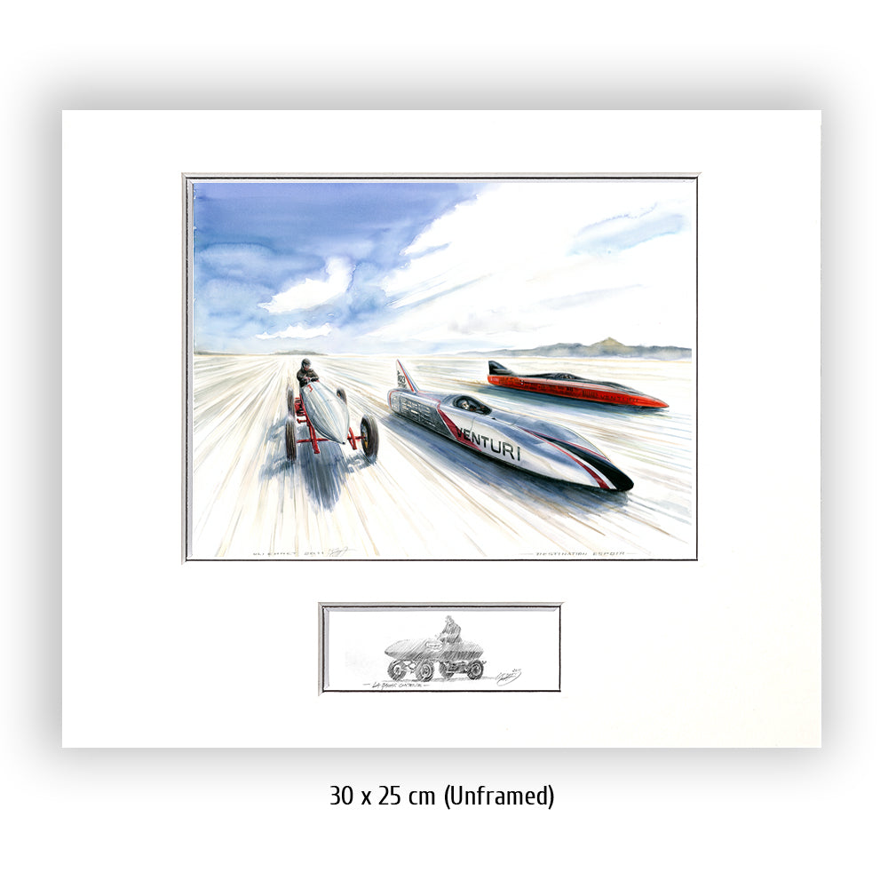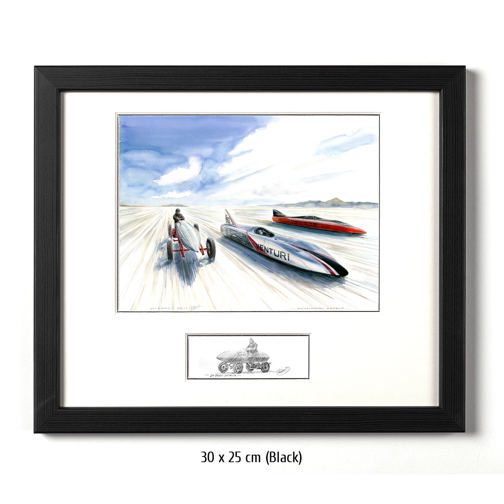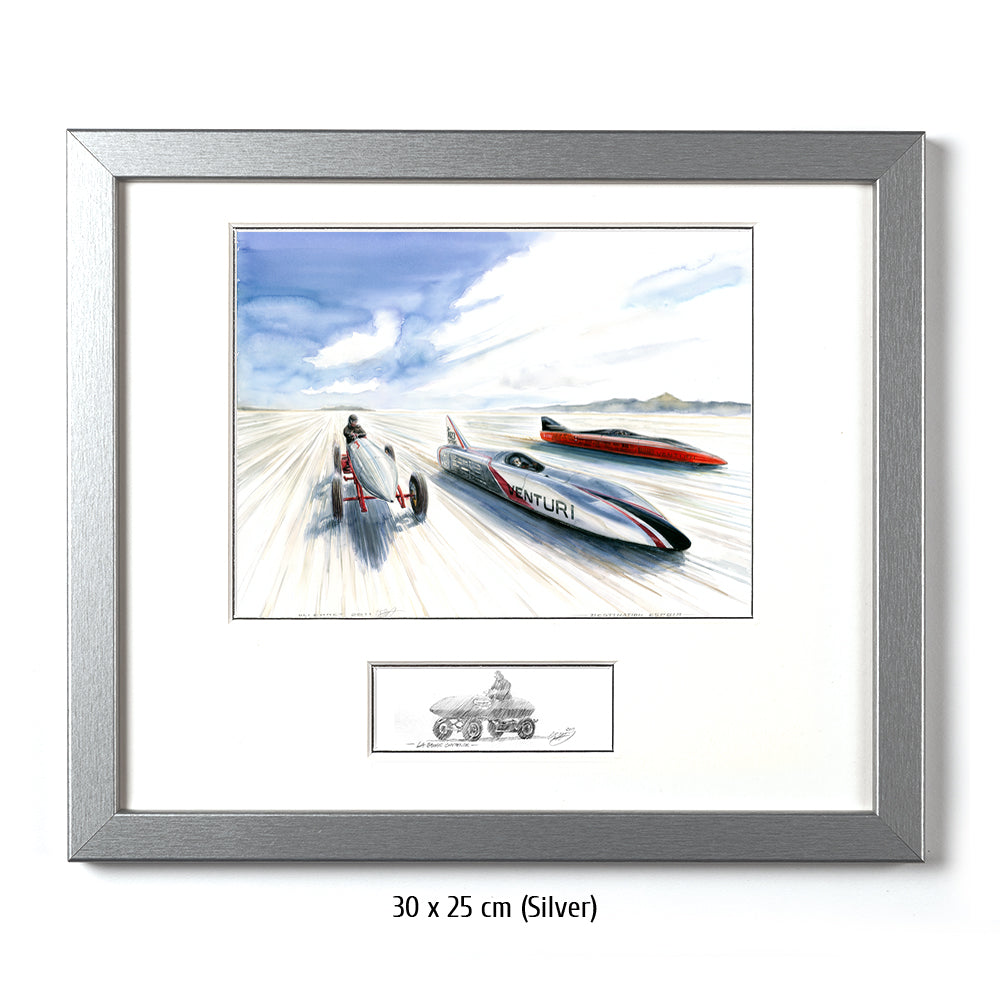 Zwei zeitgenössische Venturi Weltrekordwagen rasen über den Salzsee in Bonneville, Seite an Seite mit einem Vorreiter der Vorzeit des Rennsports. Heute sind batteriebetriebene Wagen keine Herausforderung für ihre düsenbetriebenen Rivalen, aber 1899 konnte Rennfahrer Camille Jenatzy mit der elektrisch betriebenen Jamais Contente den Rekord für sich verbuchen (linkes Fahrzeug im Bild #314). Über ein Jahrhundert später ist Venturi die Speerspitze der Designer und Hersteller von Rekordfahrzeugen mit alternativen Energieantrieben. Buckeye Bullet 2 (rechts im Bild) stellt die Meßlatte für wasserstoffbetriebene Fahrzeuge dar, während sein Stallgefährte, der Buckeye Bullet 2.5 den Rekord für elektrisch betriebene Fahrzeuge hält. Beide können Geschwindigkeiten bis nahezu 500 Stundenkilometer erreichen.