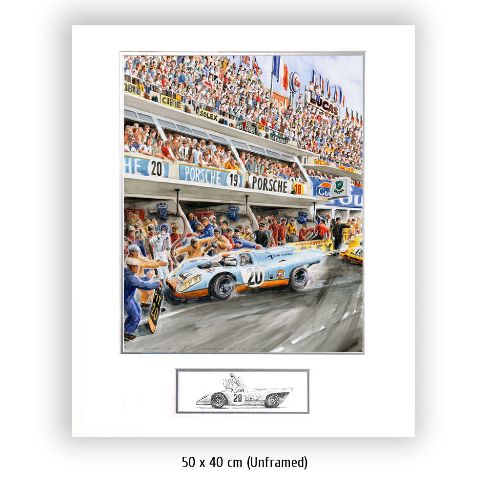 Steve McQueeen wartet geduldig, als der Porsche 917K des John Wyer Teams die Box an der Sarthe 1970 anfährt. Im Film “Le Mans”, der dem tatsächlichen Verlauf der 24 Stunden von Le Mans 1970 nur teilweise entspricht, verunglückt McQueens Filmfigur, Michael Delaney mit seinen 917, bevor er dem Team hilft doch den Gesamtsieg einzufahren. In Wirklichkeit waren es Hans Herrmann und Richard Attwood, die den ersten Gesamtsieg für Porsche in die Geschichtsbücher von Le Mans mit Ihrem Team Salzburg 917K eintrugen, während McQueens Gulf-Porsche mit der Startnummer 20, eigentlich von Jo Siffert und Brian Redman gefahren, mit Motorproblemen ausfiel.