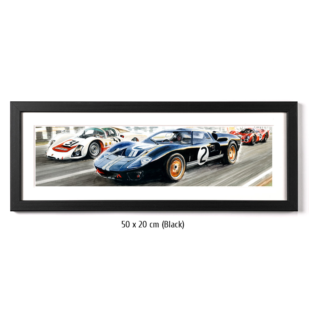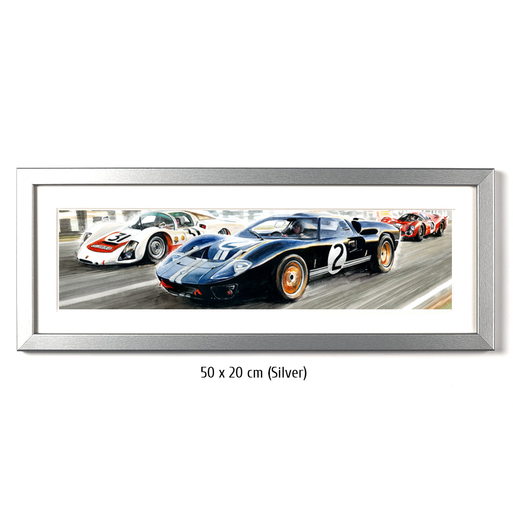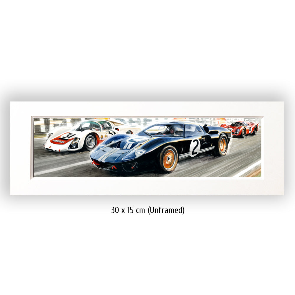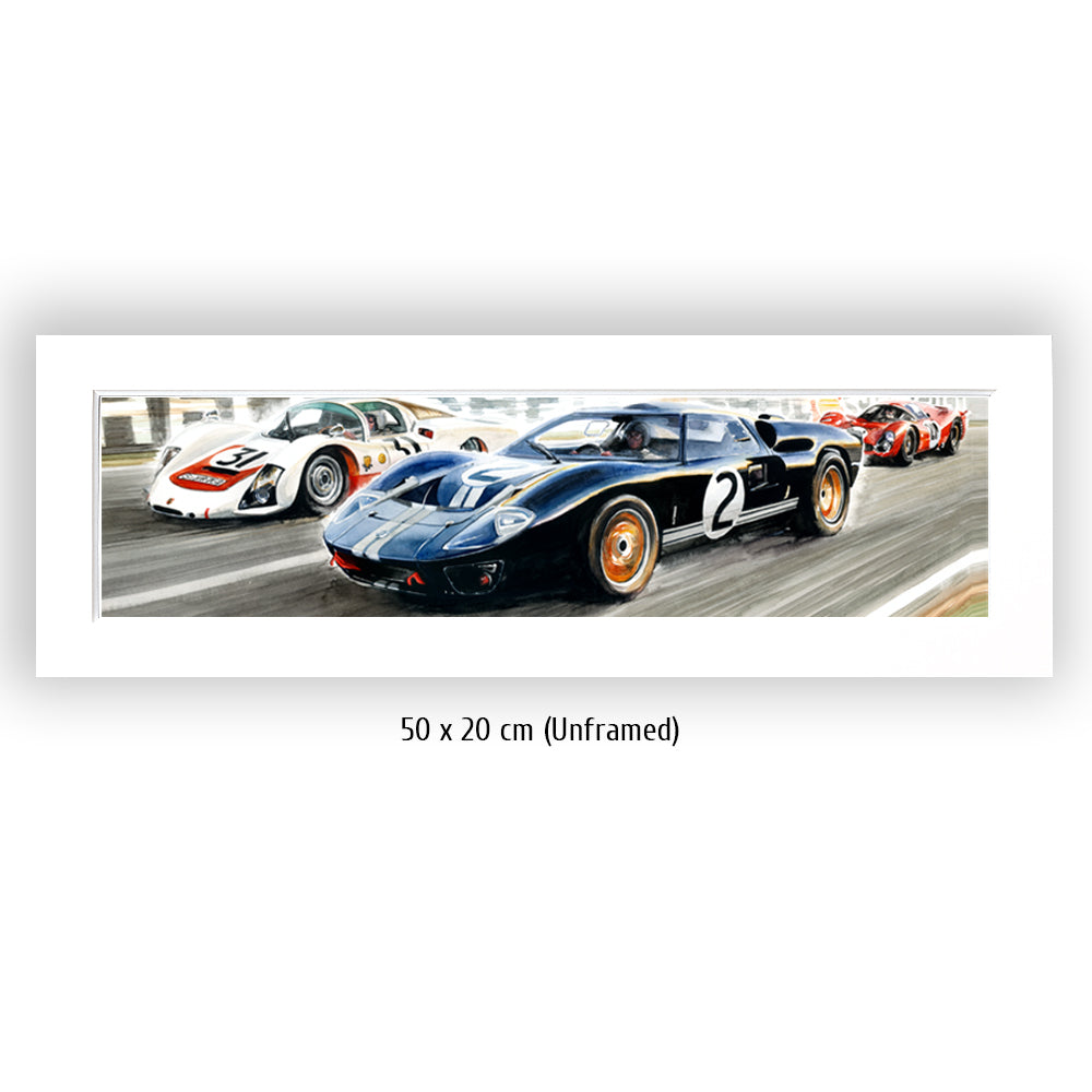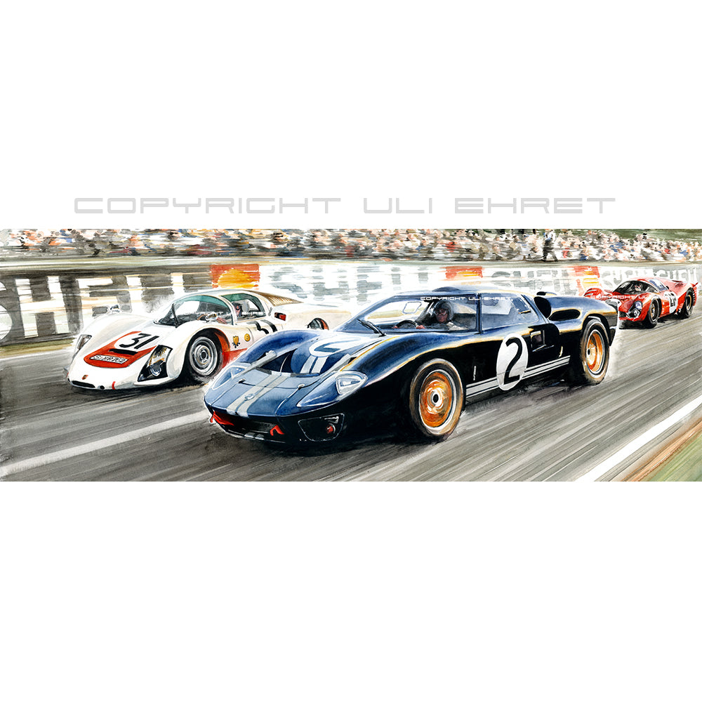 Der erste von vier aufeinanderfolgenden Siegen in Le Mans durch Ford wurde 1966 erzielt, als der GT 40 das Podium eroberte. Nach dem Erfolg der Cobra Coupés, wurde Carrol Shelby mit dem Ford Werksprogramm beauftragt – und das Ergebnis war herausragend: beide Shelby-American Rennwagen liefen auf Eins und Zwei ein. Über den bis heute engsten Zieleinlauf gibt es allerdings noch immer kontroverse Diskussionen. Mit der Absicht ein behutsam arrangiertes Foto des Zieleinlaufs zu gestalten, hatte Ford beide Fahrzeuge instruiert zusammen die Linie zu überqueren, wenn auch durch einige Meter getrennt. Der führende Ken Miles und Bruce McLaren an zweiter Stelle, taten folgsam was Ihnen aufgetragen wurde. Aber weder die beiden Piloten noch die Teamleitung hatten die Startaufstellung in Betracht gezogen, so dass am Ende von der Rennleitung entschieden wurde, dass McLaren und Chris Amon die größere Renndistanz hinter sich gelegt hatten. Somit stand fest, dass Miles und Teampartner Dennis Hulme wegen ungefähr acht Metern das Rennen verloren hatten. Im Gemälde ist darüberhinaus der Porsche 906 von Herrmann/Linge und der Ferrari 330 P3 von Bandini/Guichet abgebildet. Sowohl Ferrari als auch Porsche hatten eine Armada an Fahrzeugen und erstklassigen Piloten nach Le Mans entsendet. Doch Ford sicherte sich den Doppel-Erfolg in einem denkwürdigen Rennen.