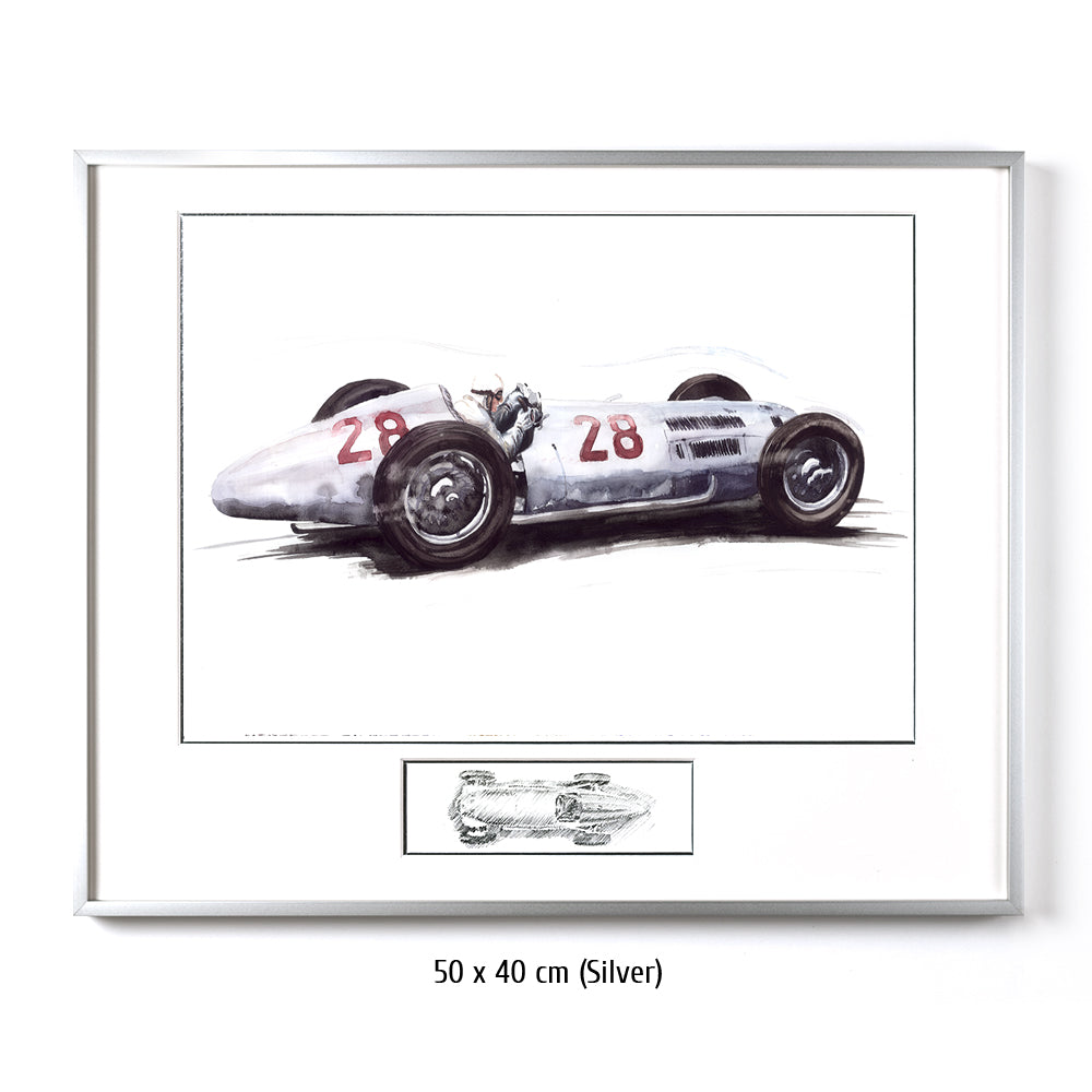 Der Silberpfeil, wie ihn sich der Laie vorstellt: der W 154. Ein Monster aus Metall. Riesengroß und mit einer faszinierenden Präsenz. Fotos auf denen ein Fahrer in Bremgarten versucht das Auto wieder in Fahrtrichtung zu schieben, nachdem es sich gedreht hatte, überwältigten mich. Die schiere Größe und Länge des Autos machten mich sprachlos. So wollte ich zeigen, wie ein Fahrer, hier ist es Hermann Lang, diesen Riesen in die Knie zwingt. Eine besondere Note erhielt das Bild für mich, als Peter Lang den Druck 1/100 zum 100. Geburtstag des Vaters bei mir bestellte.