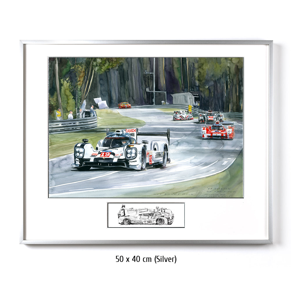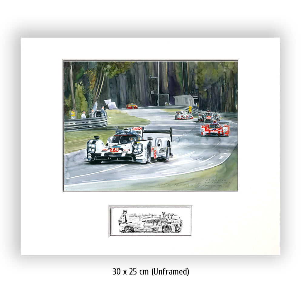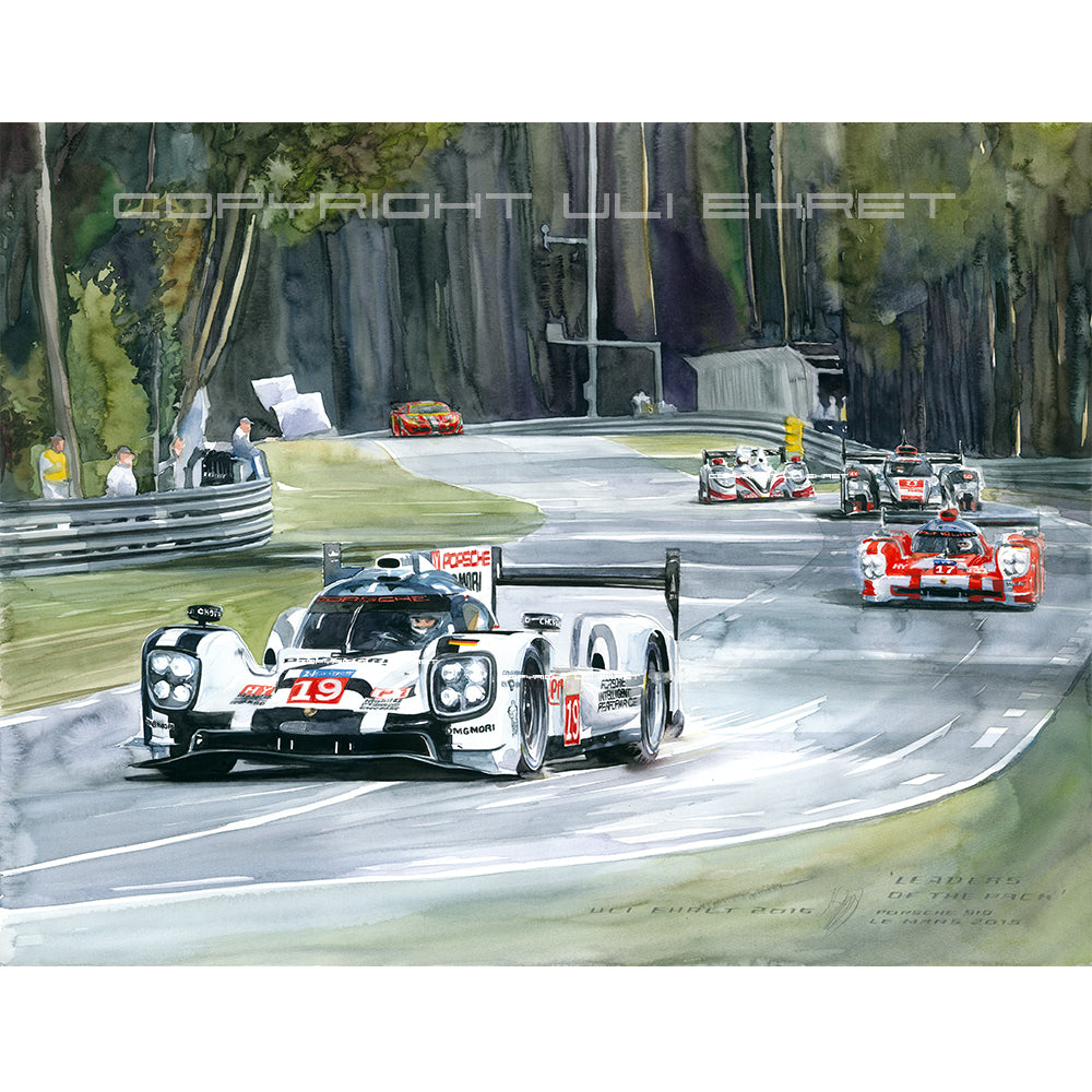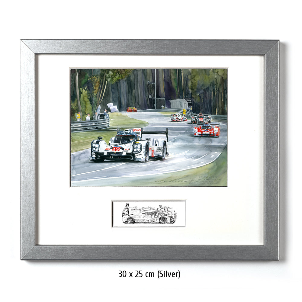 Porsche kehrte 2015 nach Le Mans mit drei Autos zurück. Verbesserte Versionen der im Vorjahr eingeführten 919. Der „Leader of the Pack“ war überraschenderweise der Wagen mit der Startnummer 19 von Nico Hülkenberg, … und … der hier gerade auf dem Abschnitt der täglich öffentlich genutzten Straßen durch die Wälder vor dem Rechtsknick, der Zufahrt zur scharfen Linkskurve, der Indianapoliskurve donnert. Die Stallgefährten Mark Webber, Brendon Hartley und Timo Bernhard in der Nummer 17 folgen dicht auf, knapp vor den Audi R18 Nummer 8 von Loïc Duval, Lucas Di Grassi und Oliver Jarvis. Ein weiterer Teil der Verfolgergruppe zeigt den erfolgreichen Gibson 015S eingesetzt von Jota Sport mit dem Fahrer Simon Dolan am Steuer, co-pilotiert von Mitch Evans und Oliver Turvey – Klassensieger im Jahr zuvor, aber Zweiter im Jahr 2015.