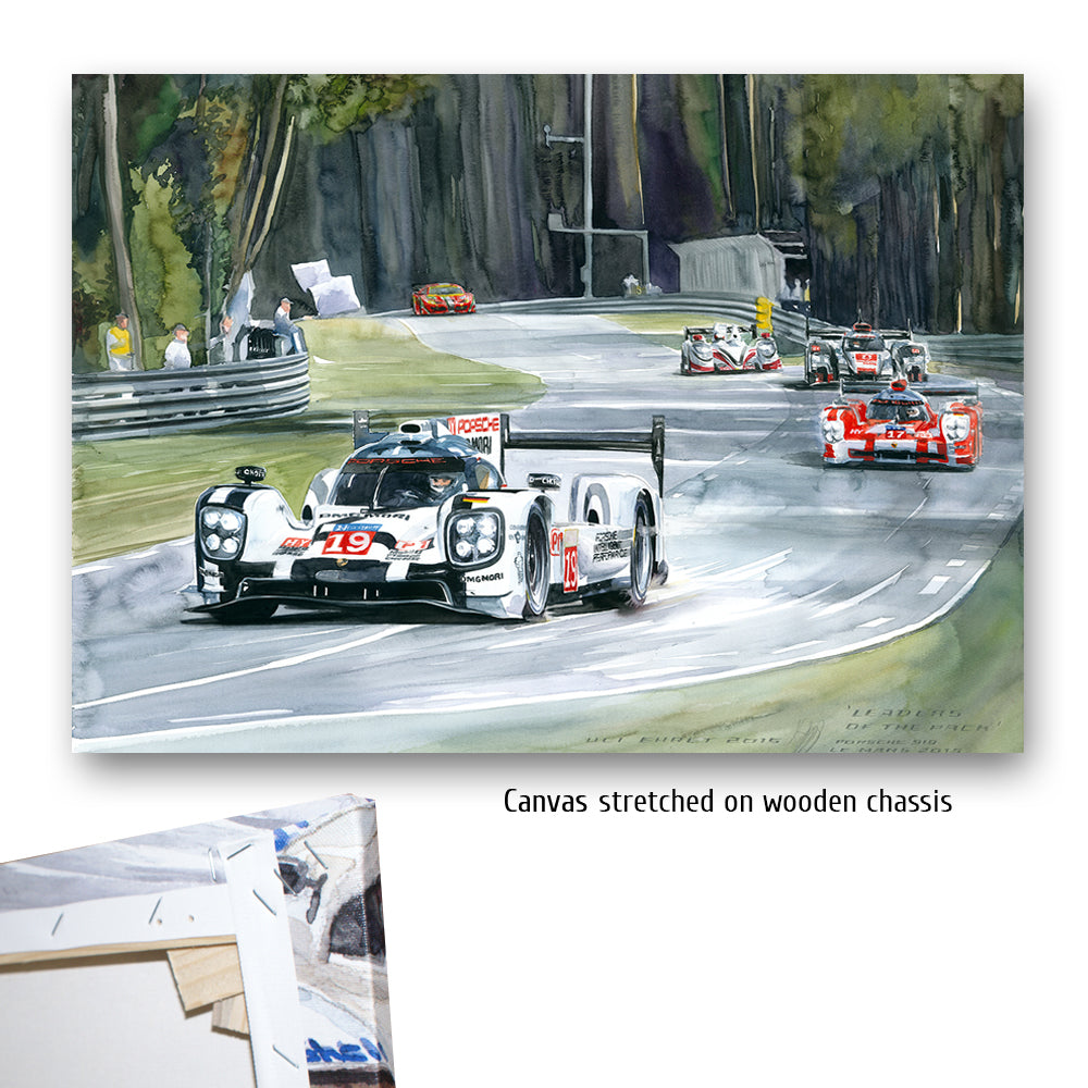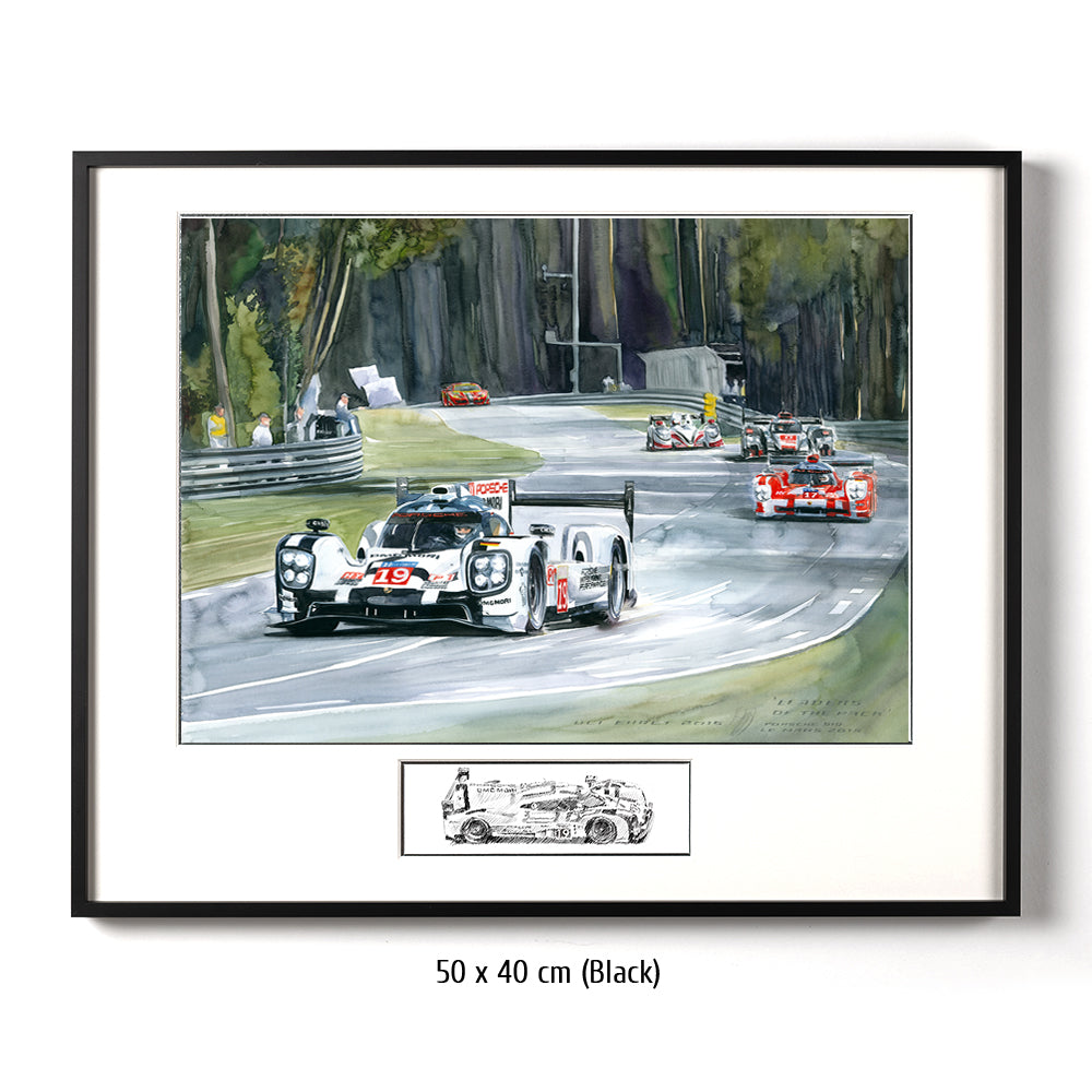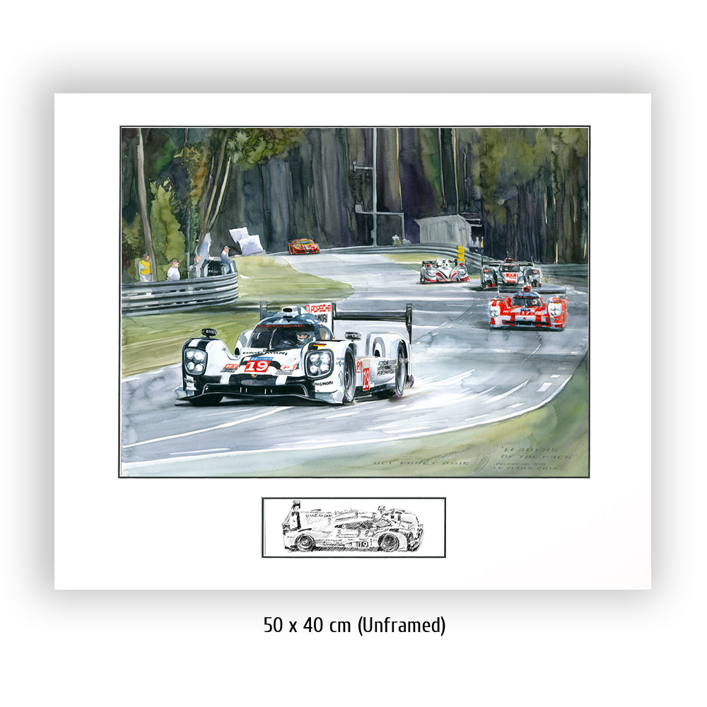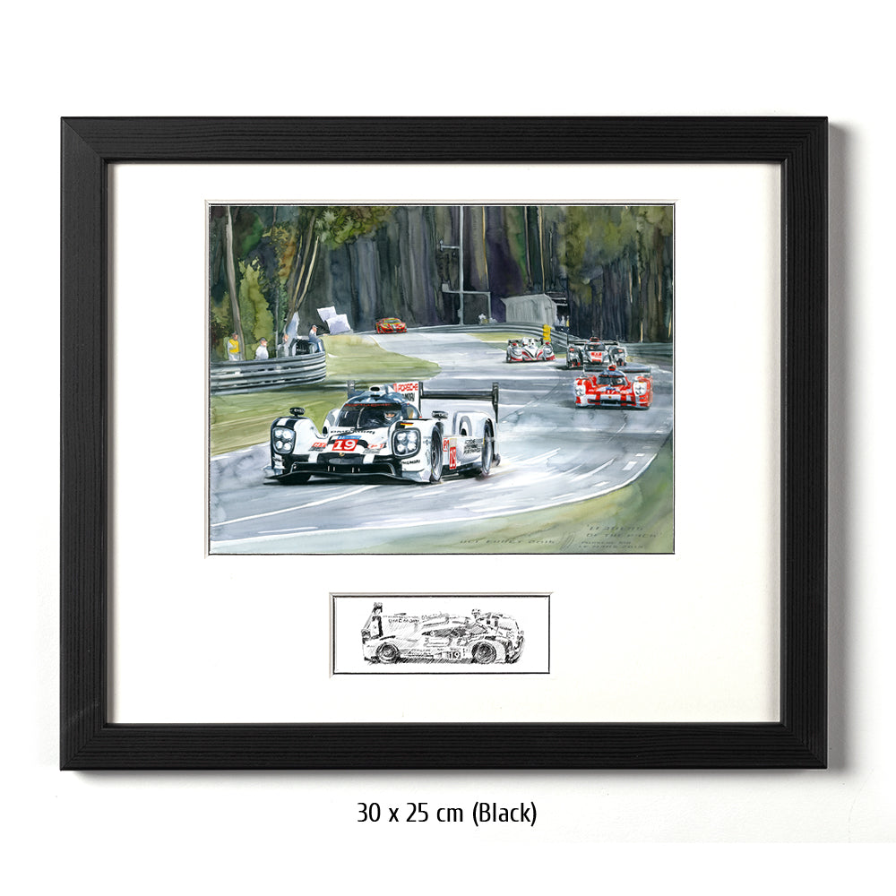 Porsche kehrte 2015 nach Le Mans mit drei Autos zurück. Verbesserte Versionen der im Vorjahr eingeführten 919. Der „Leader of the Pack“ war überraschenderweise der Wagen mit der Startnummer 19 von Nico Hülkenberg, … und … der hier gerade auf dem Abschnitt der täglich öffentlich genutzten Straßen durch die Wälder vor dem Rechtsknick, der Zufahrt zur scharfen Linkskurve, der Indianapoliskurve donnert. Die Stallgefährten Mark Webber, Brendon Hartley und Timo Bernhard in der Nummer 17 folgen dicht auf, knapp vor den Audi R18 Nummer 8 von Loïc Duval, Lucas Di Grassi und Oliver Jarvis. Ein weiterer Teil der Verfolgergruppe zeigt den erfolgreichen Gibson 015S eingesetzt von Jota Sport mit dem Fahrer Simon Dolan am Steuer, co-pilotiert von Mitch Evans und Oliver Turvey – Klassensieger im Jahr zuvor, aber Zweiter im Jahr 2015.