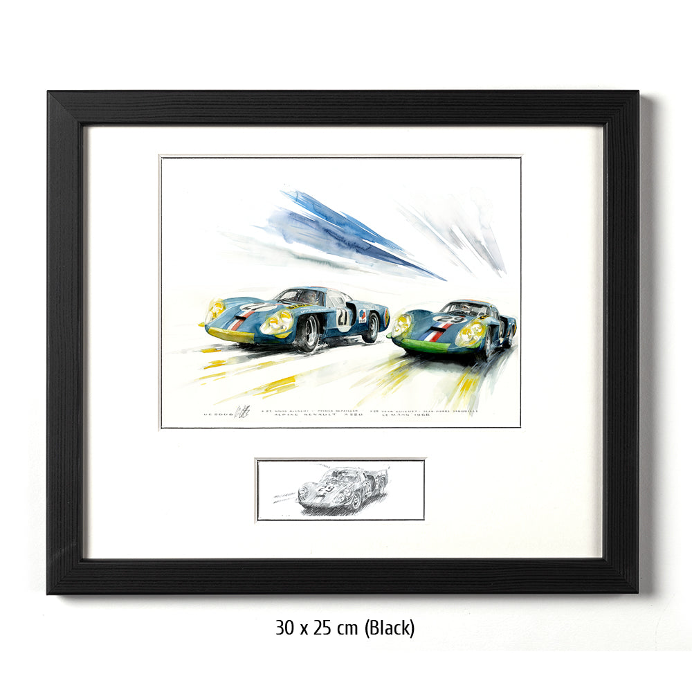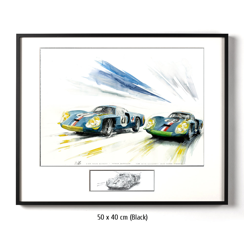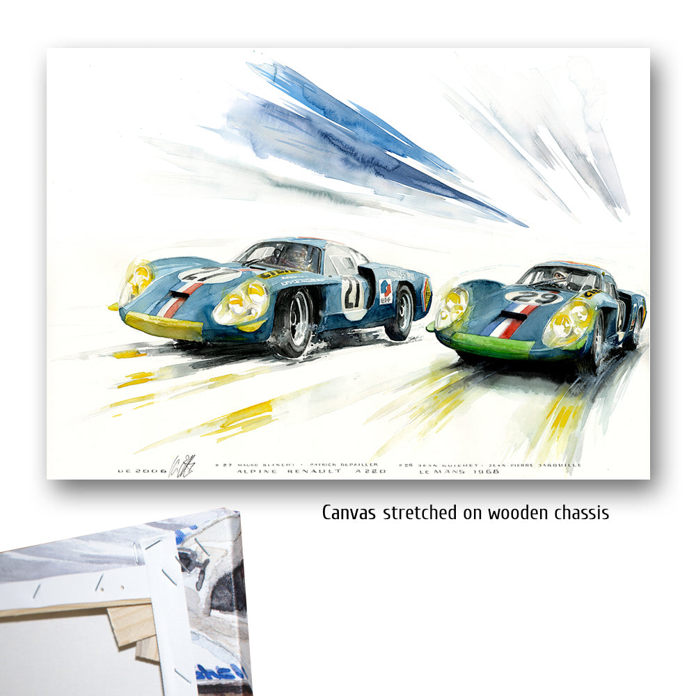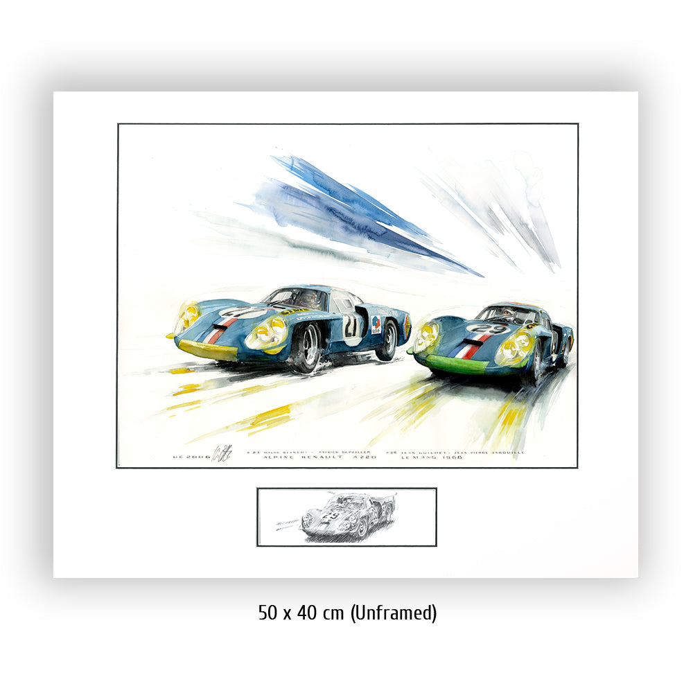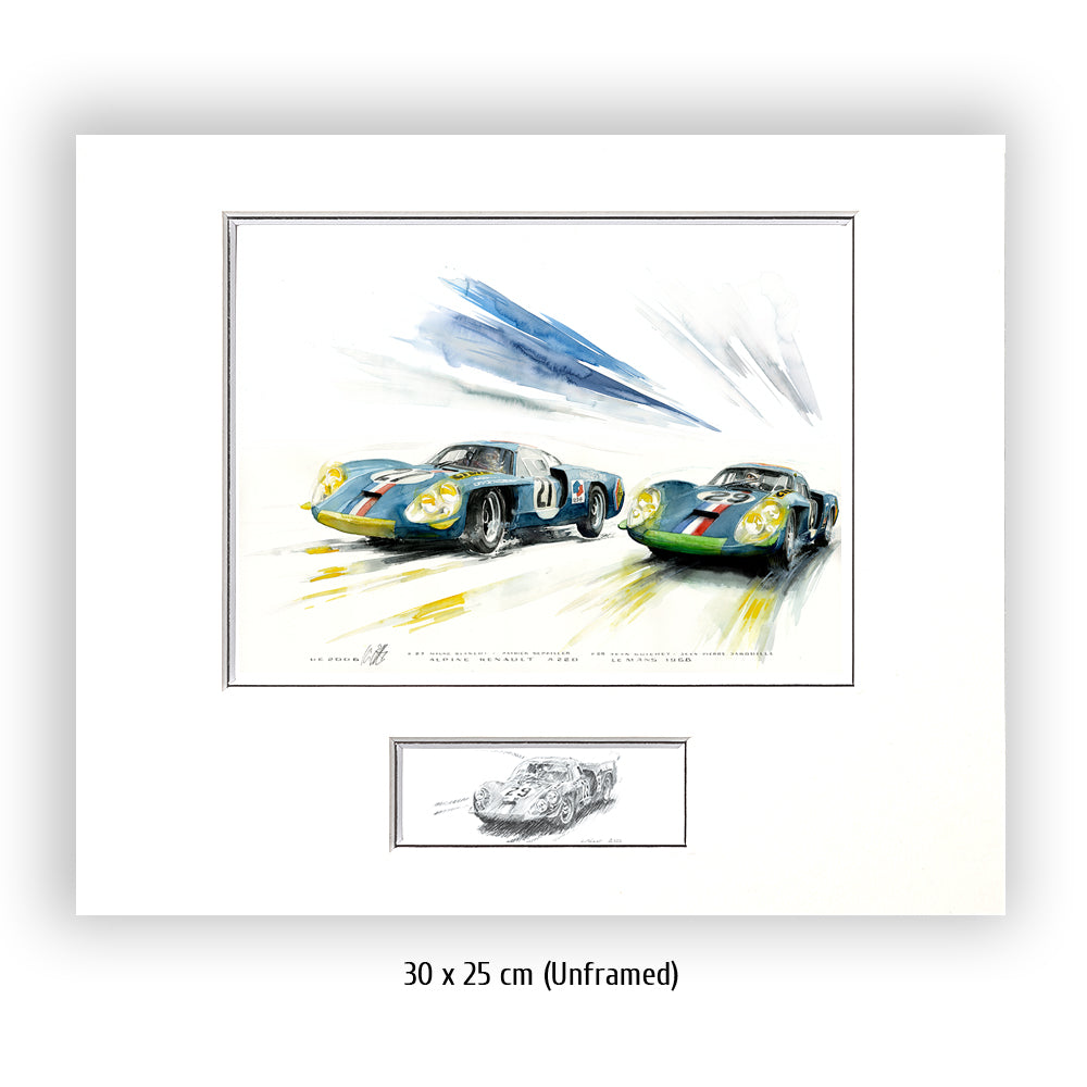 Der in Dieppe geborene Jean Rédélé wählte den Namen Alpine für seine eigenen Wagen, nachdem er 1954 in den französischen Alpen zu großem Erfolg im Rallyesport mit seinem Renault 4C gefahren war. Er entwickelte seine auf Renault basierenden Wagen kontinuierlich weiter. Mit attraktiven Karosserien und einiger Unterstützung durch Renault hatte er großen Erfolg bei Rallyes. Zunächst wurden 1,5 Liter Alpine-Wagen in Le Mans in den Mittsechzigern eingesetzt, aber es war die 3 Liter Formel, 1968 in Le Mans eingeführt, die den Alpine den Weg auf einen Gesamtsieg ermöglichte. Der A220 war das Resultat der Kombination eines neuen Rohrrahmens verkleidet mit einer neuen, aerodynamischen Karosserie und ausgestattet mit einem 3 Liter V8 Gordini Motor, der durch die Verbauung von zwei 1,5 Liter Blocks geschaffen wurde. Auf der rechten Seite des Aquarells sieht man einen solchen Werkswagen, der von Jean-Pierre Jabouille und Jean Guichet gefahren wurde. Links davon ein von Ecurie Savin-Calberson eingesetzter 220, gefahren von Mauro Bianchi und Patrick Depailler. Keines der Fahrzeuge sah die Ziellinie.