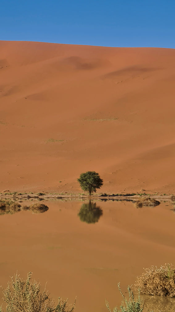 Das Sossusvlei Tal in Namibia bietet unzählige Überraschungen. Der Kontrast des Sees und der Wüste könnte nicht größer sein.